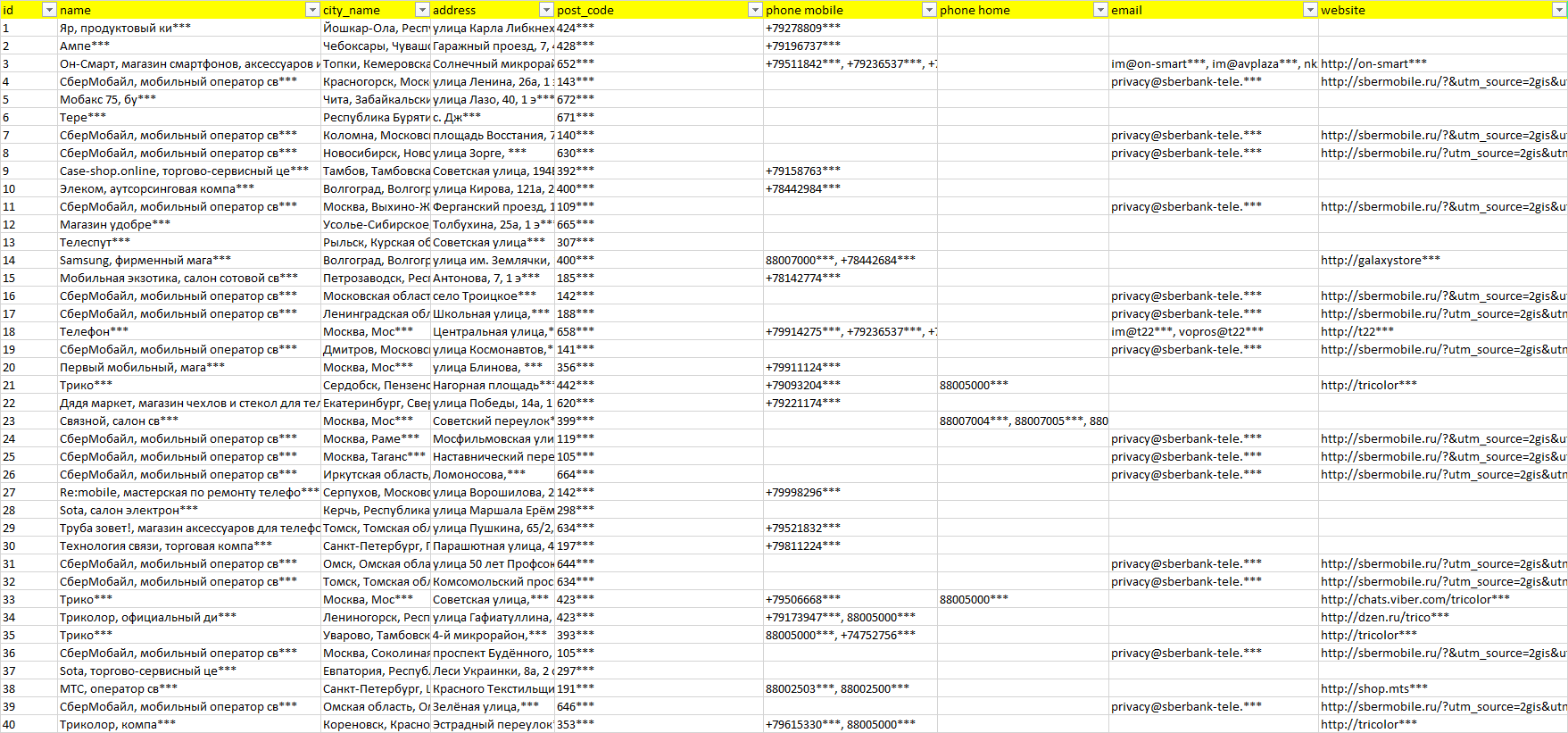 База компаний помощь в подключении услуг связи, вся РФ в формате Excel с эл. почтами, телефонами, сайтами, ссылками на соц сети, координатами и другой информацией. Скачайте демо версию, чтобы ознакомиться с данными.