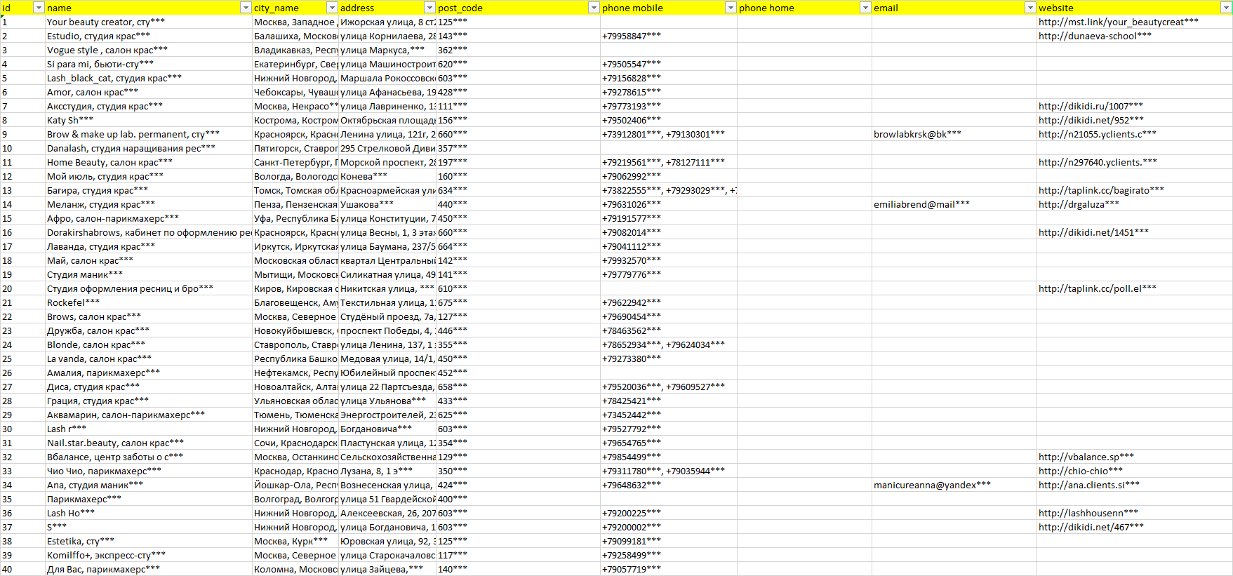 База компаний оформление бровей и ресниц, вся РФ в формате Excel с эл. почтами, телефонами, сайтами, ссылками на соц сети, координатами и другой информацией. Скачайте демо версию, чтобы ознакомиться с данными.
