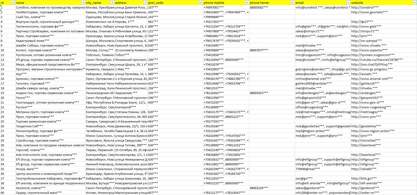 База компаний геодезическое оборудование, вся РФ в формате Excel с эл. почтами, телефонами, сайтами, ссылками на соц сети, координатами и другой информацией. Скачайте демо версию, чтобы ознакомиться с данными.