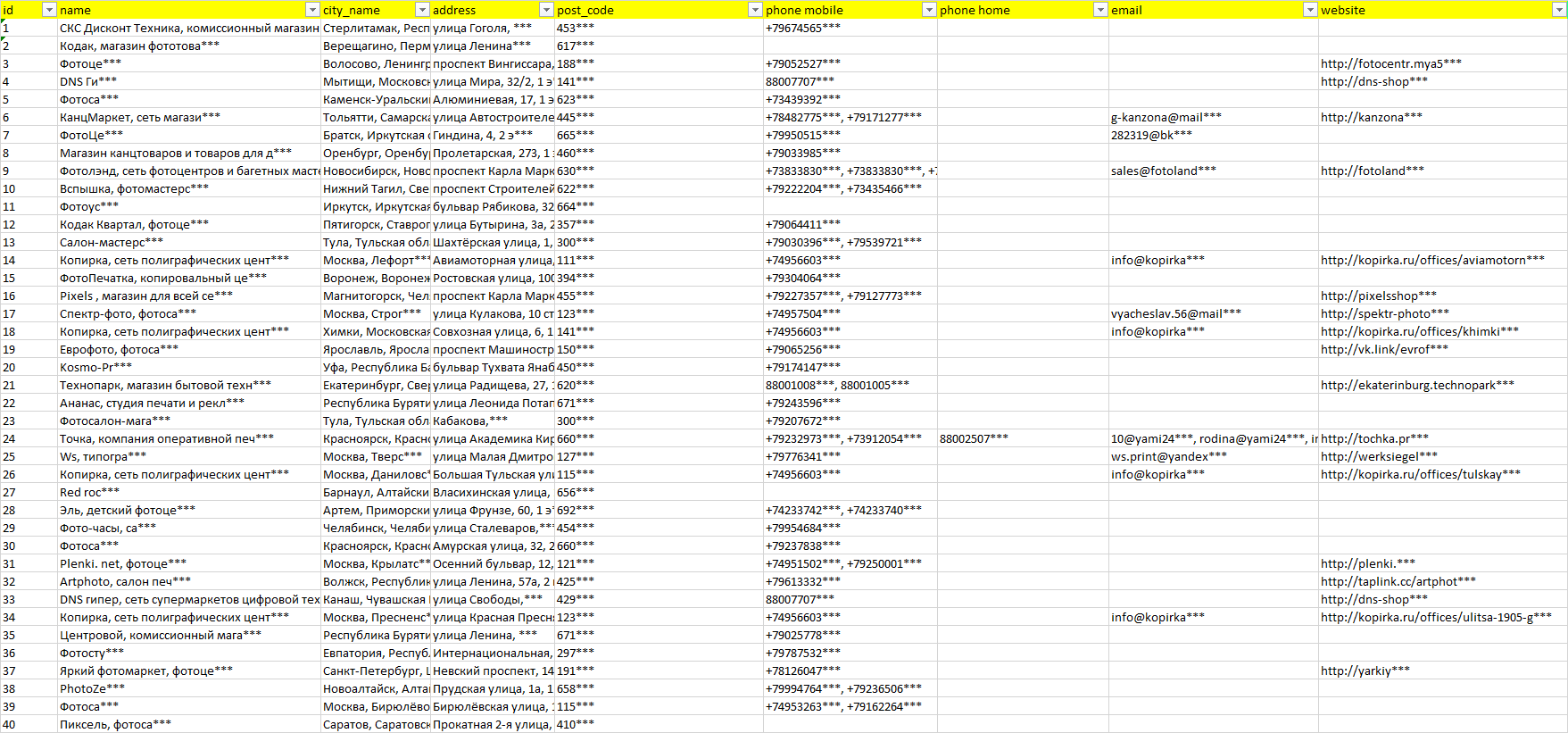 База компаний фототовары, вся РФ в формате Excel с эл. почтами, телефонами, сайтами, ссылками на соц сети, координатами и другой информацией. Скачайте демо версию, чтобы ознакомиться с данными.