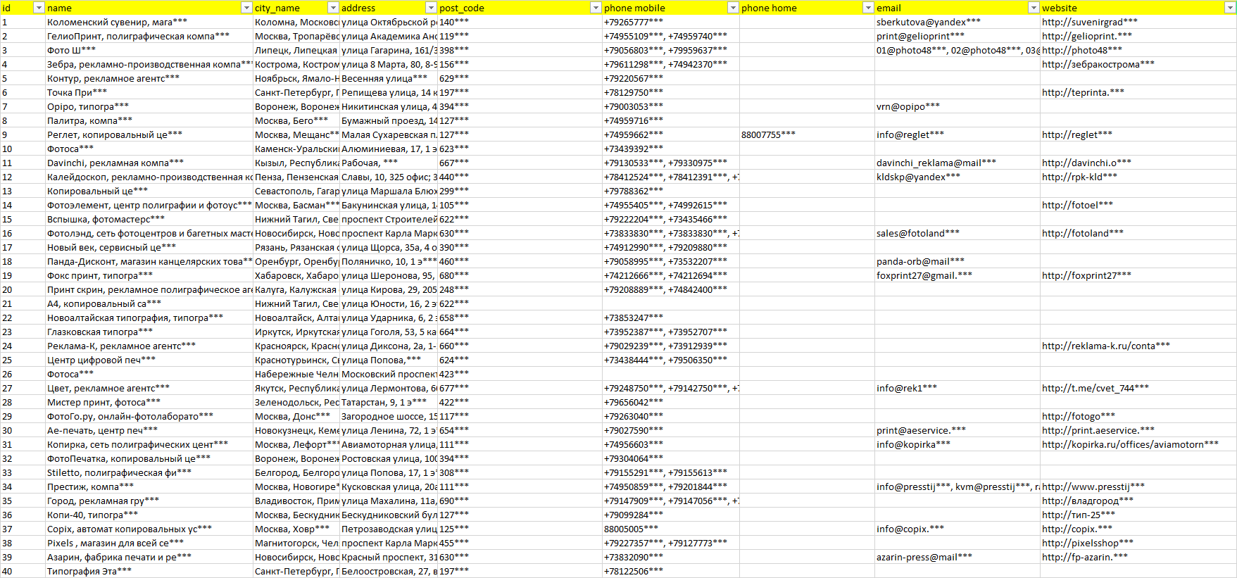 База организаций оперативная полиграфия, вся Россия в формате Excel с эл. почтами, телефонами, сайтами, ссылками на соц сети, координатами и другой информацией. Скачайте демо версию, чтобы ознакомиться с данными.