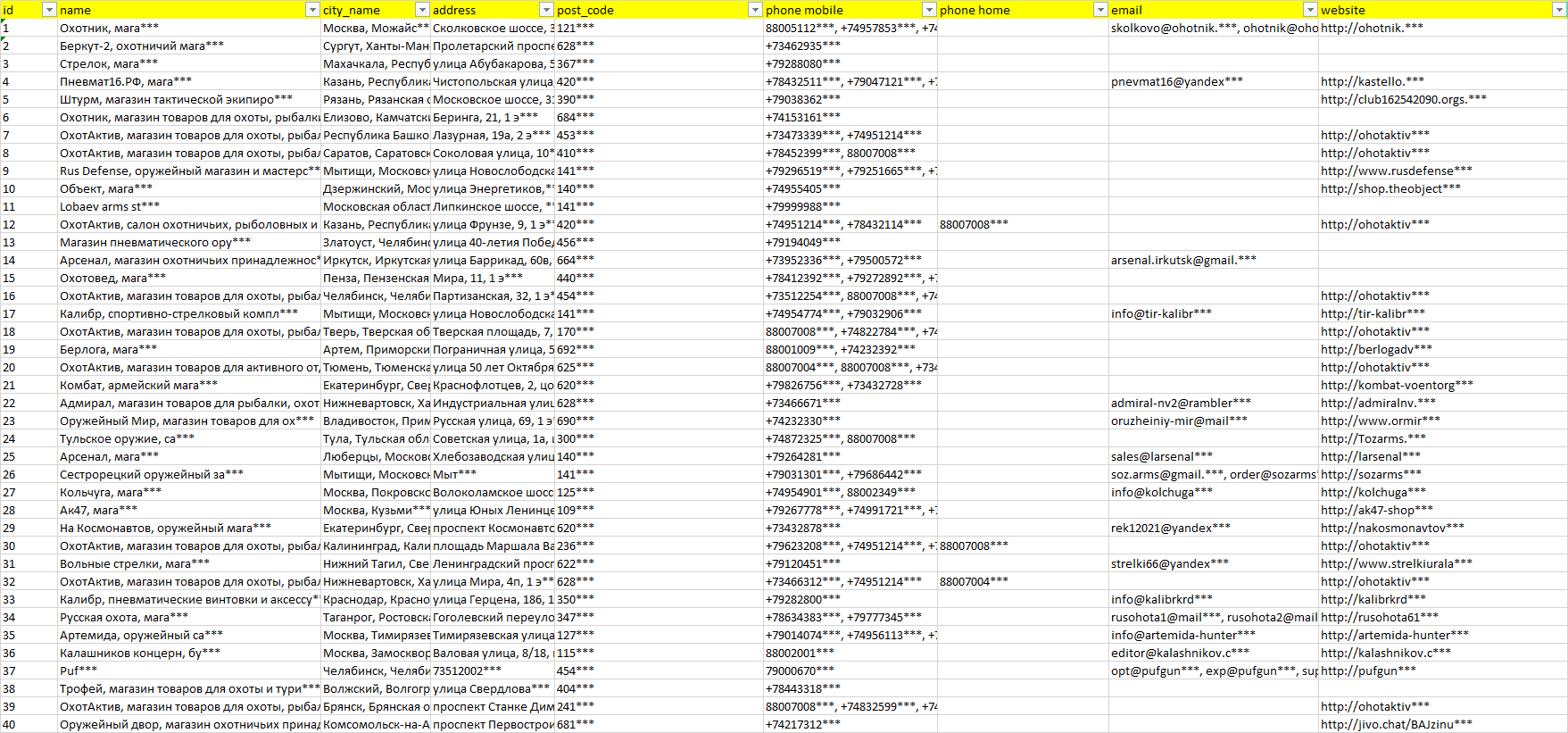 База компаний оружейные магазины, вся РФ в формате Excel с эл. почтами, телефонами, сайтами, ссылками на соц сети, координатами и другой информацией. Скачайте демо версию, чтобы ознакомиться с данными.