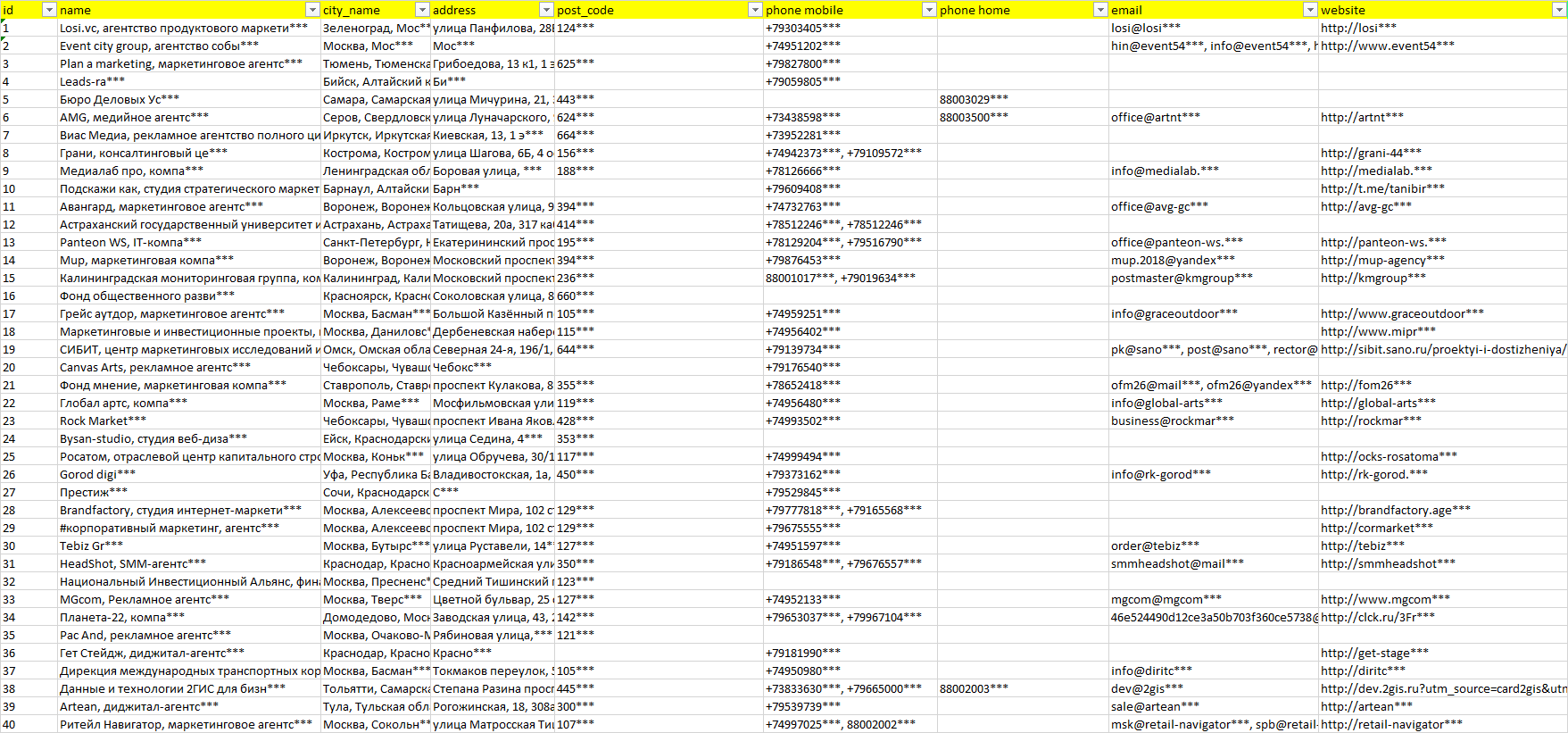 Мы автоматически собираем такие данные с различных открытых источников, обрабатываем, структурирует и упорядочиваем их, предоставляя пользователю возможность скачать результат в формате Excel. По принципу работы наш сервис аналогичен поисковым системам, таким как Google или Яндекс, но с возможностью экспорта найденной информации в удобном табличном виде.