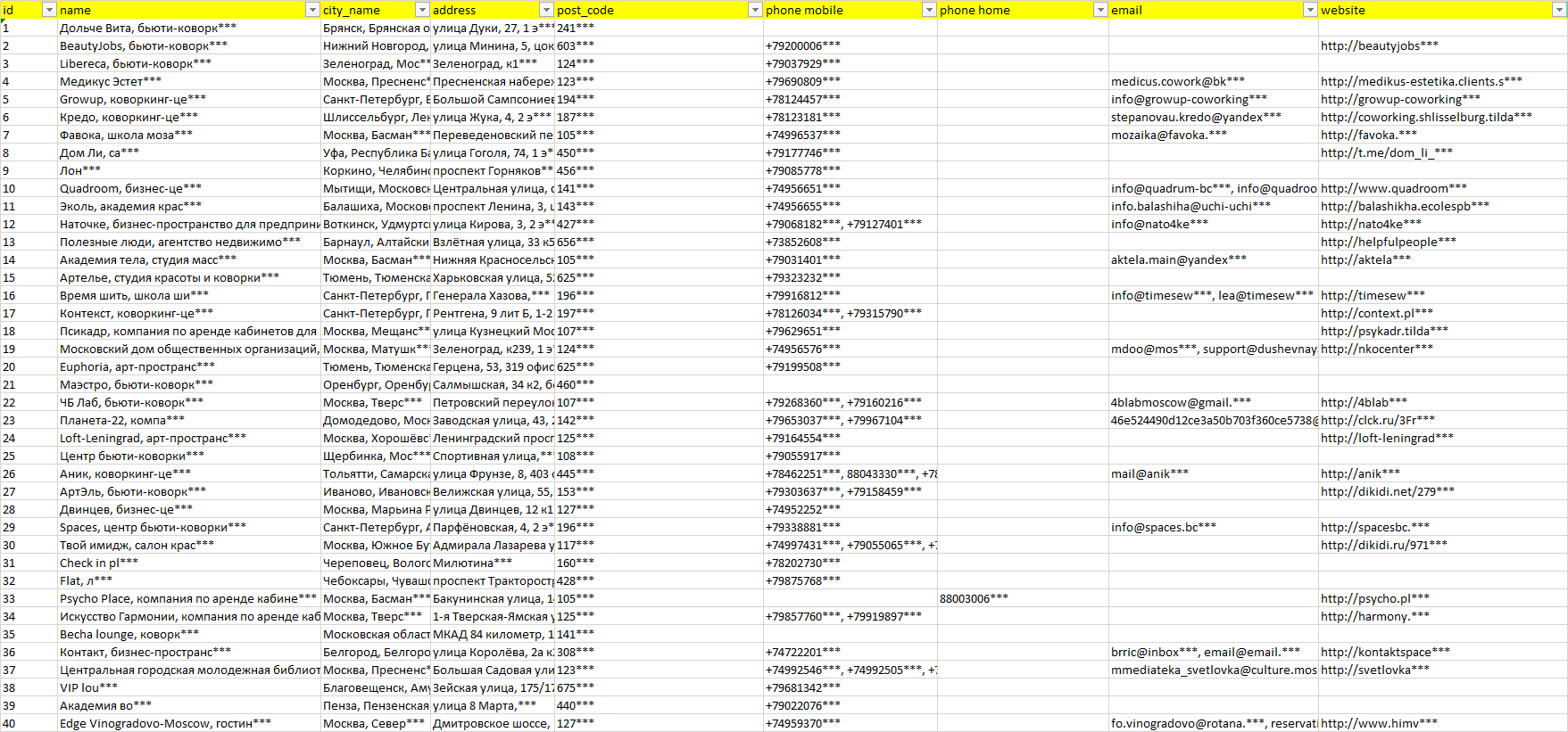 База компаний коворкинг, вся РФ в формате Excel с эл. почтами, телефонами, сайтами, ссылками на соц сети, координатами и другой информацией. Скачайте демо версию, чтобы ознакомиться с данными.