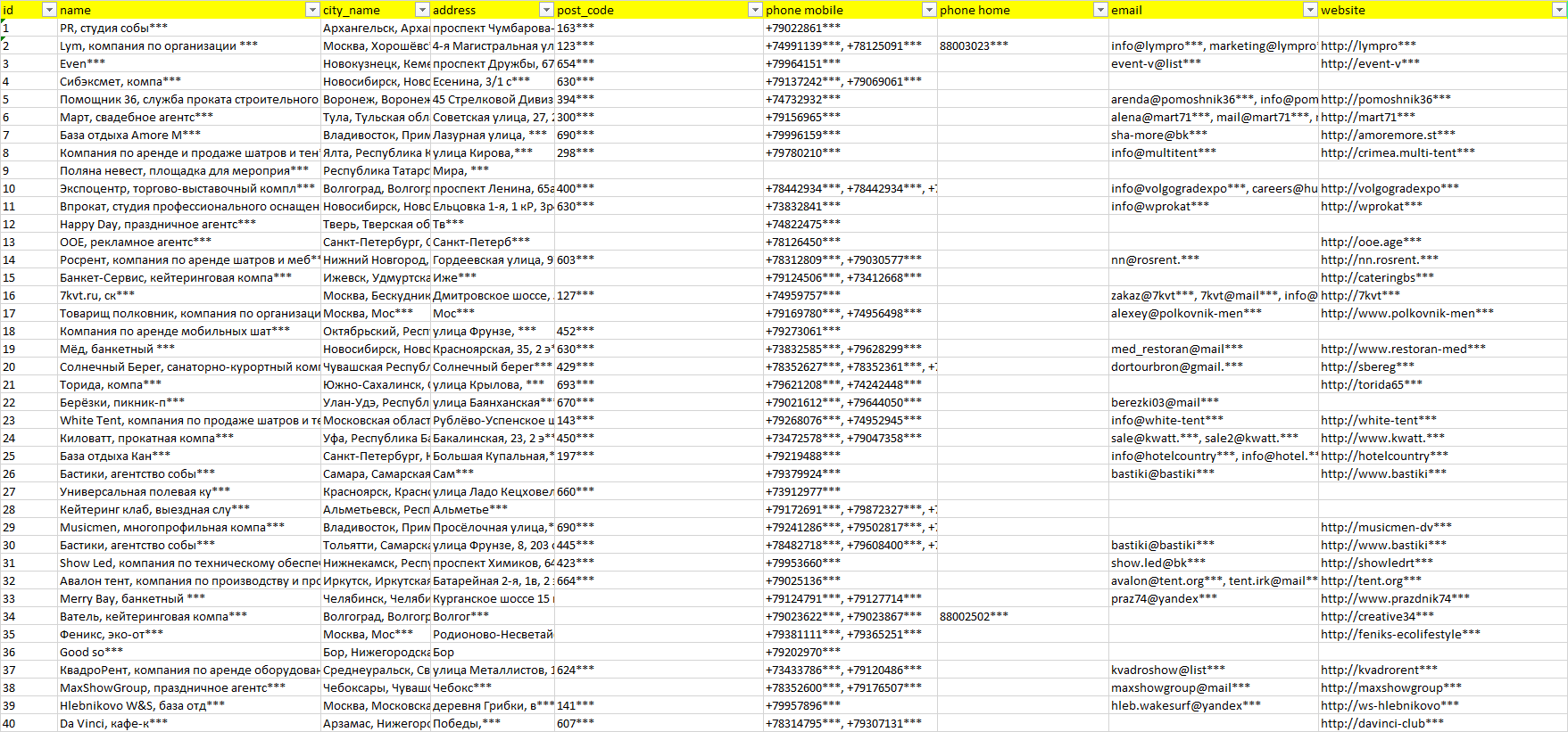 База организаций аренда шатров и конструкций, вся Россия в формате Excel с эл. почтами, телефонами, сайтами, ссылками на соц сети, координатами и другой информацией. Скачайте демо версию, чтобы ознакомиться с данными.