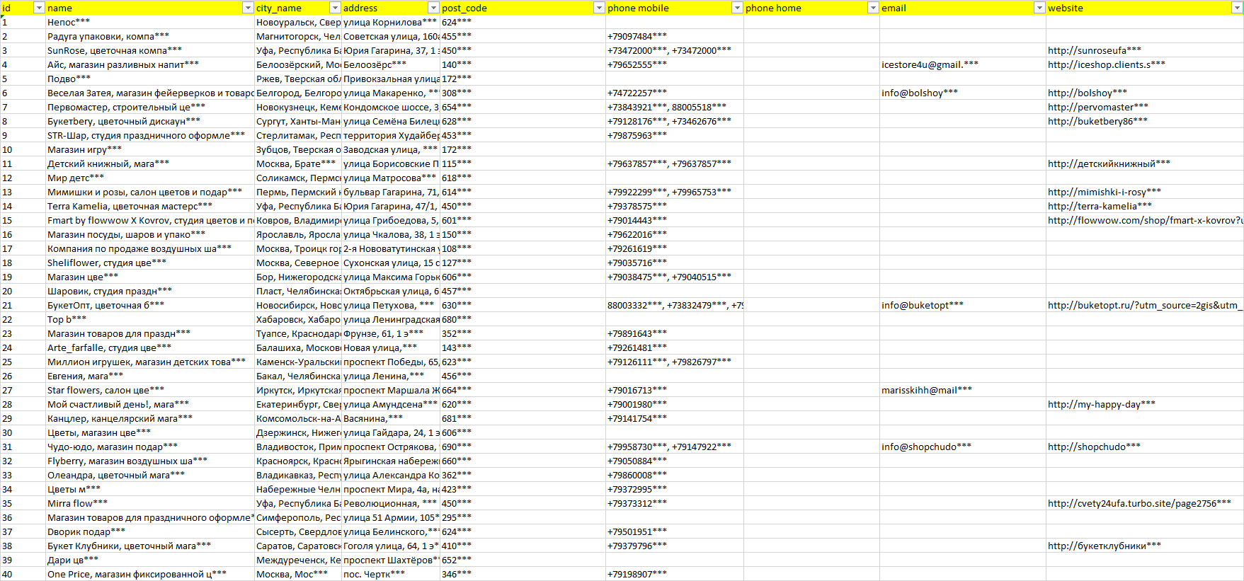База организаций товары для праздников, вся Россия в формате Excel с эл. почтами, телефонами, сайтами, ссылками на соц сети, координатами и другой информацией. Скачайте демо версию, чтобы ознакомиться с данными.