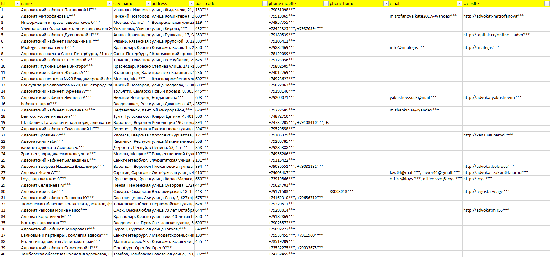 База организаций услуги адвоката, вся Россия в формате Excel с эл. почтами, телефонами, сайтами, ссылками на соц сети, координатами и другой информацией. Скачайте демо версию, чтобы ознакомиться с данными.