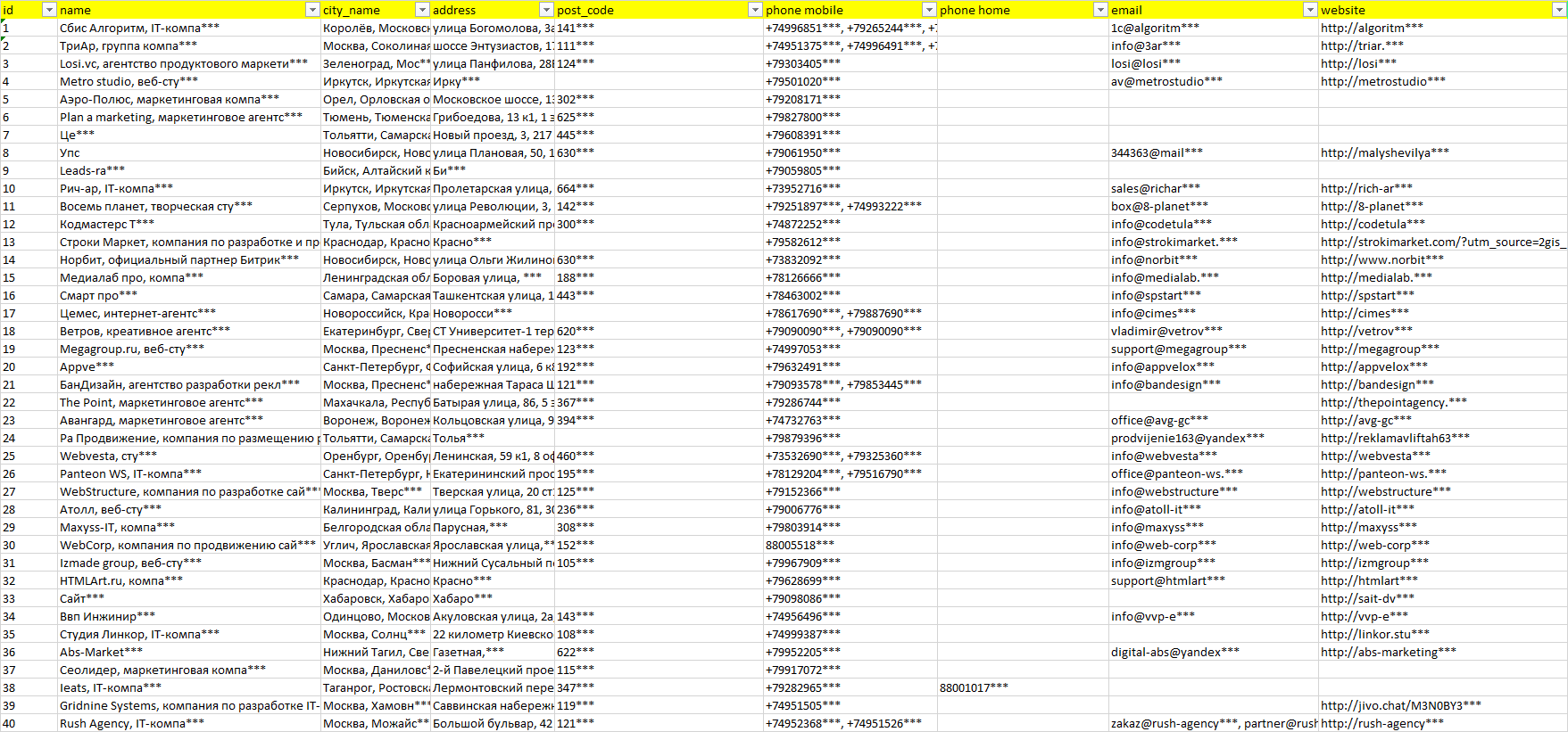 База организаций разработка и продвижение сайтов, вся Россия в формате Excel с эл. почтами, телефонами, сайтами, ссылками на соц сети, координатами и другой информацией. Скачайте демо версию, чтобы ознакомиться с данными.