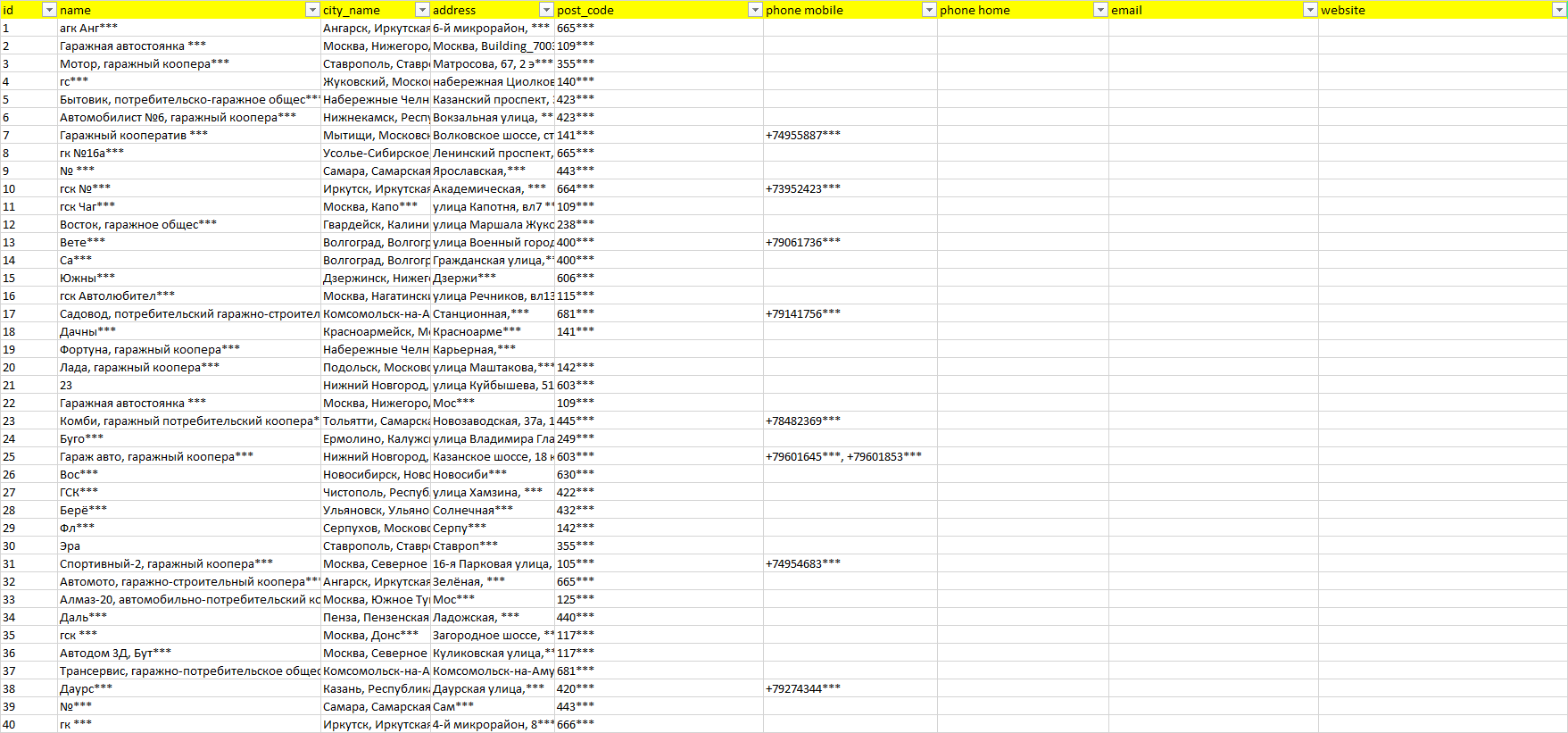 База компаний гаражные кооперативы, вся РФ в формате Excel с эл. почтами, телефонами, сайтами, ссылками на соц сети, координатами и другой информацией. Скачайте демо версию, чтобы ознакомиться с данными.