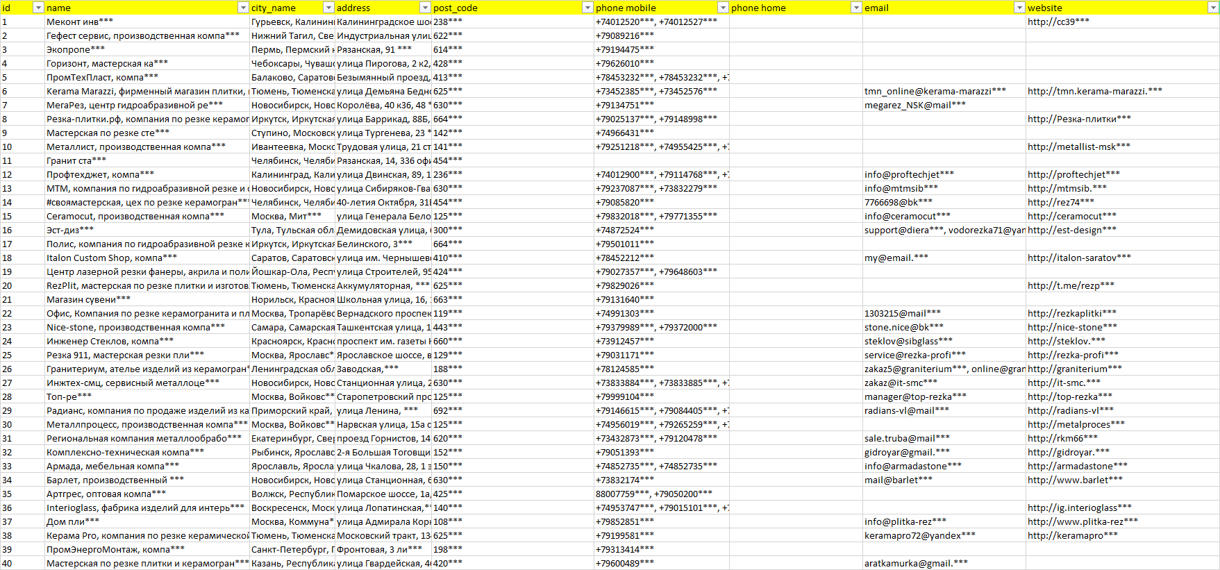 База организаций гидроабразивная резка неметаллов, вся Россия в формате Excel с эл. почтами, телефонами, сайтами, ссылками на соц сети, координатами и другой информацией. Скачайте демо версию, чтобы ознакомиться с данными.