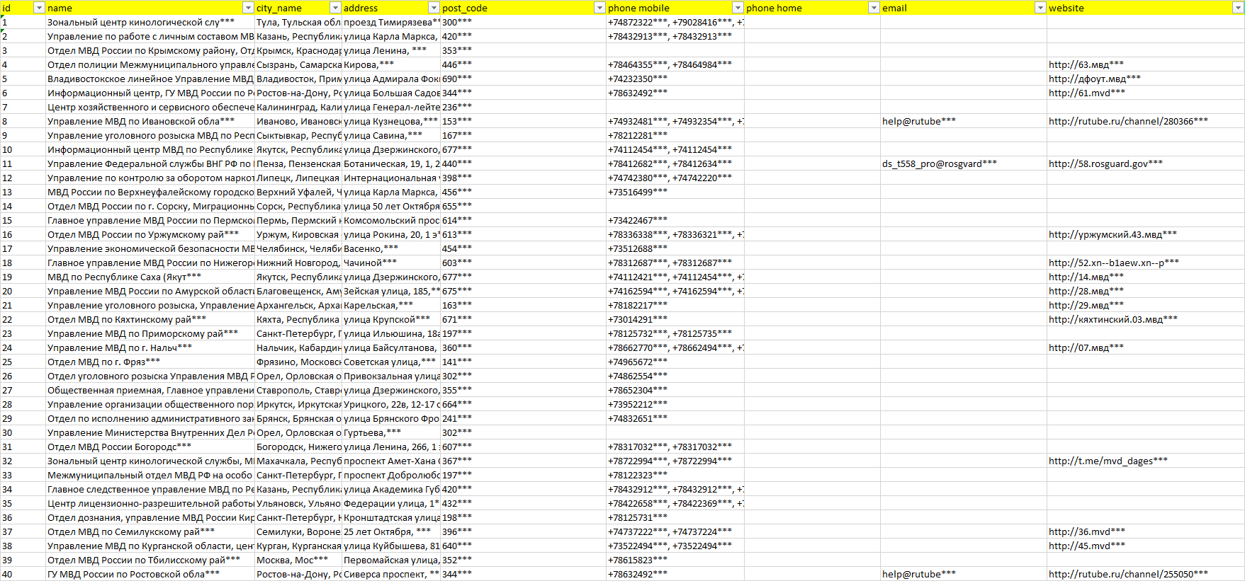 База организаций омвд умвд гумвд мвд, вся Россия в формате Excel с эл. почтами, телефонами, сайтами, ссылками на соц сети, координатами и другой информацией. Скачайте демо версию, чтобы ознакомиться с данными.
