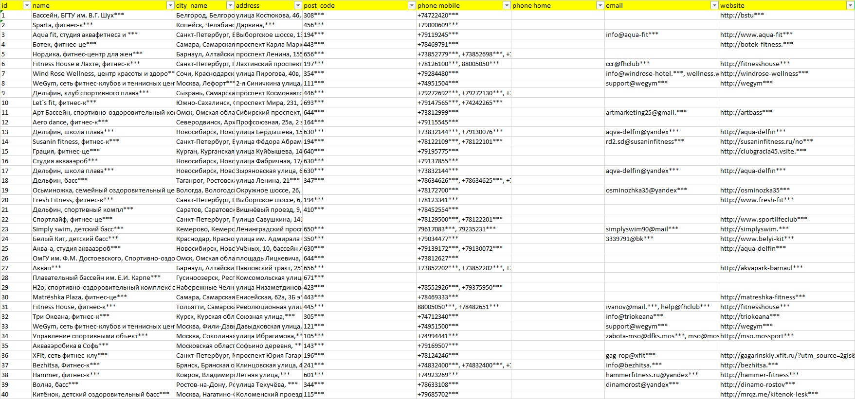 База организаций аквааэробика, вся Россия в формате Excel с эл. почтами, телефонами, сайтами, ссылками на соц сети, координатами и другой информацией. Скачайте демо версию, чтобы ознакомиться с данными.