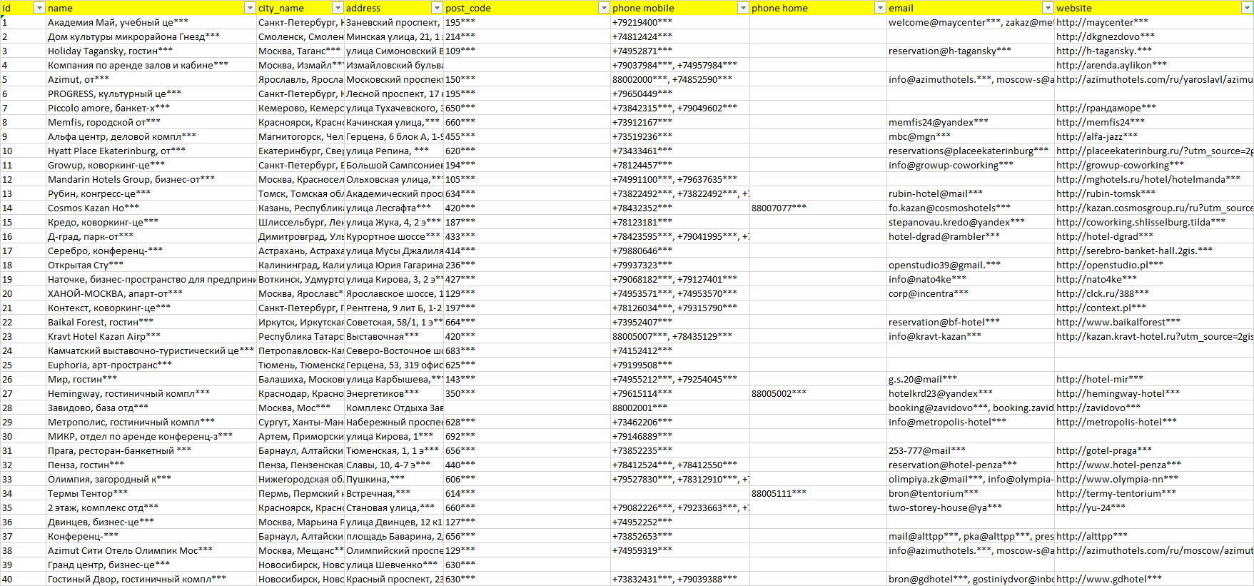 База компаний конференц-залы, вся РФ в формате Excel с эл. почтами, телефонами, сайтами, ссылками на соц сети, координатами и другой информацией. Скачайте демо версию, чтобы ознакомиться с данными.