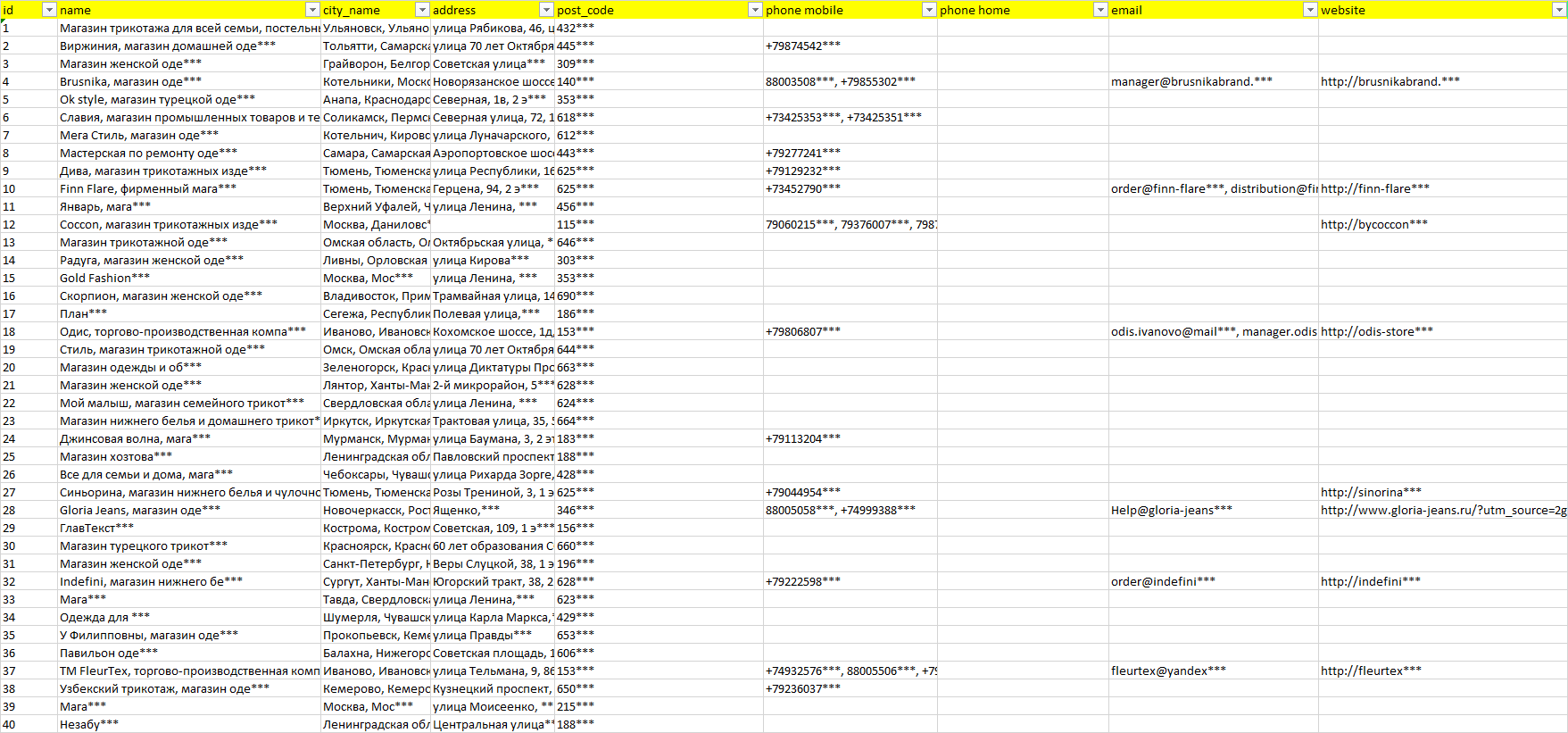 База организаций трикотажные изделия, вся Россия в формате Excel с эл. почтами, телефонами, сайтами, ссылками на соц сети, координатами и другой информацией. Скачайте демо версию, чтобы ознакомиться с данными.