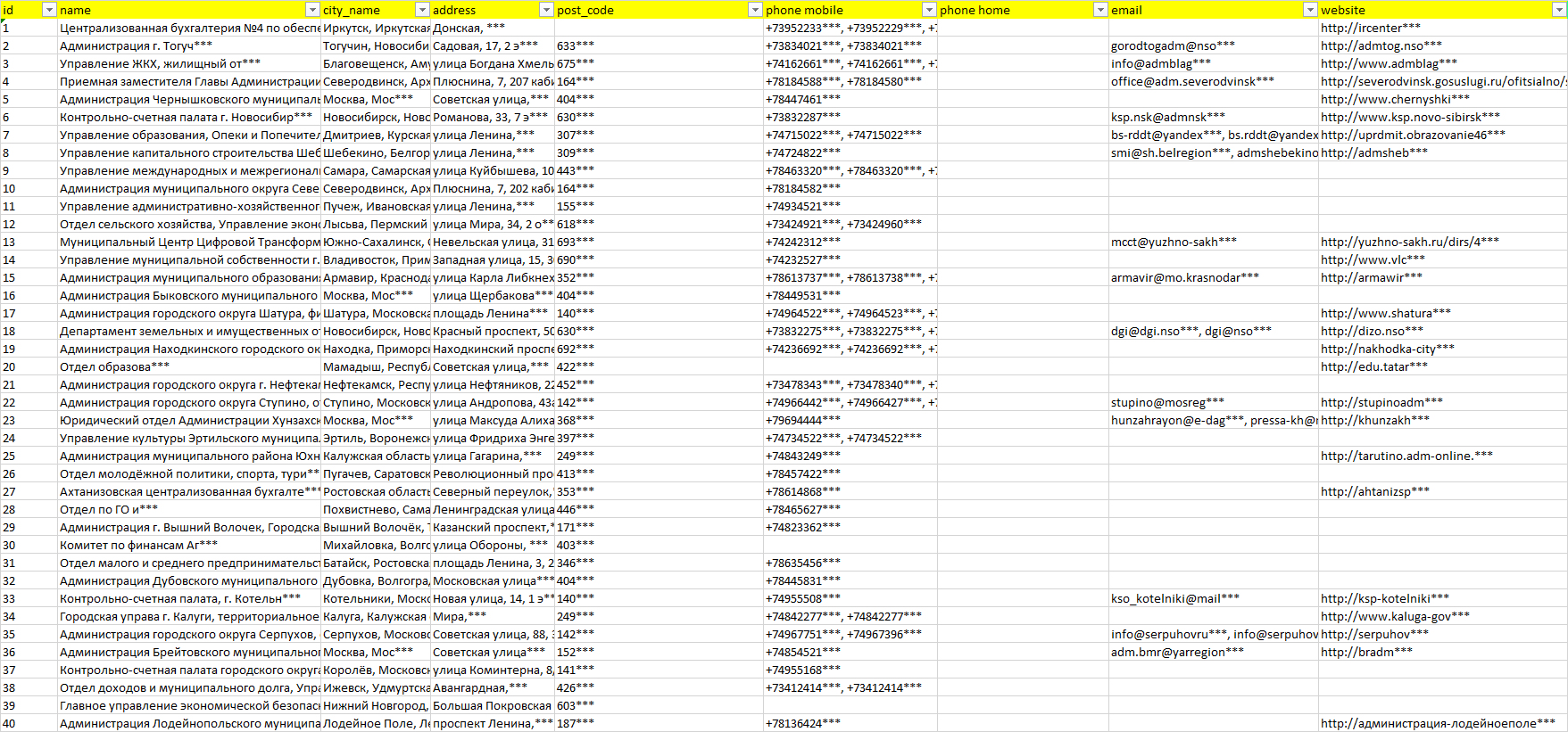 База компаний администрация города городского округа, вся РФ в формате Excel с эл. почтами, телефонами, сайтами, ссылками на соц сети, координатами и другой информацией. Скачайте демо версию, чтобы ознакомиться с данными.