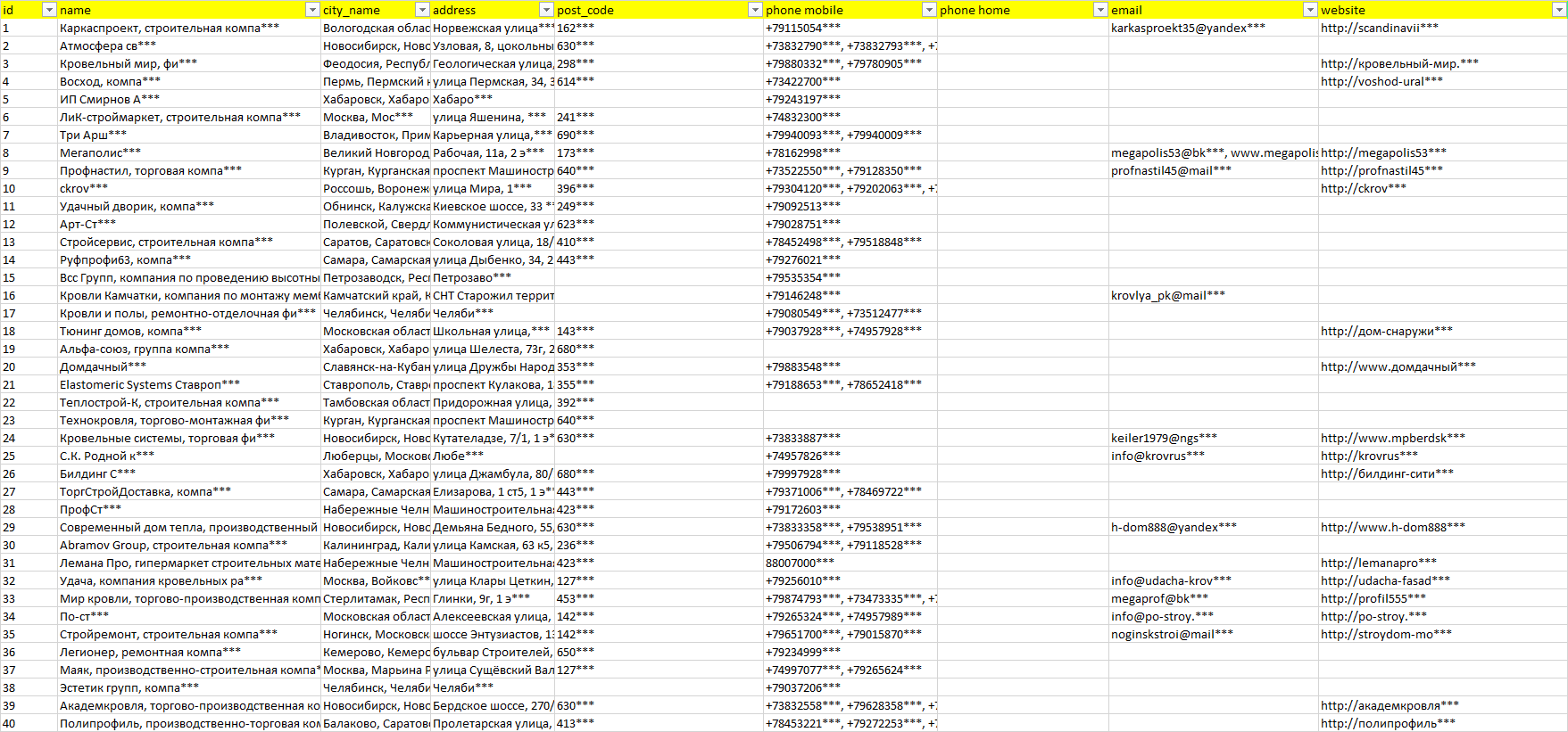 База компаний кровельные работы, вся РФ в формате Excel с эл. почтами, телефонами, сайтами, ссылками на соц сети, координатами и другой информацией. Скачайте демо версию, чтобы ознакомиться с данными.