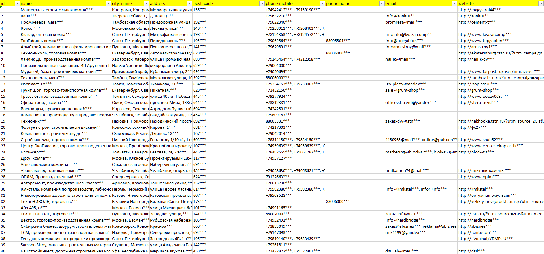 База компаний материалы для дорожного строительства, вся РФ в формате Excel с эл. почтами, телефонами, сайтами, ссылками на соц сети, координатами и другой информацией. Скачайте демо версию, чтобы ознакомиться с данными.