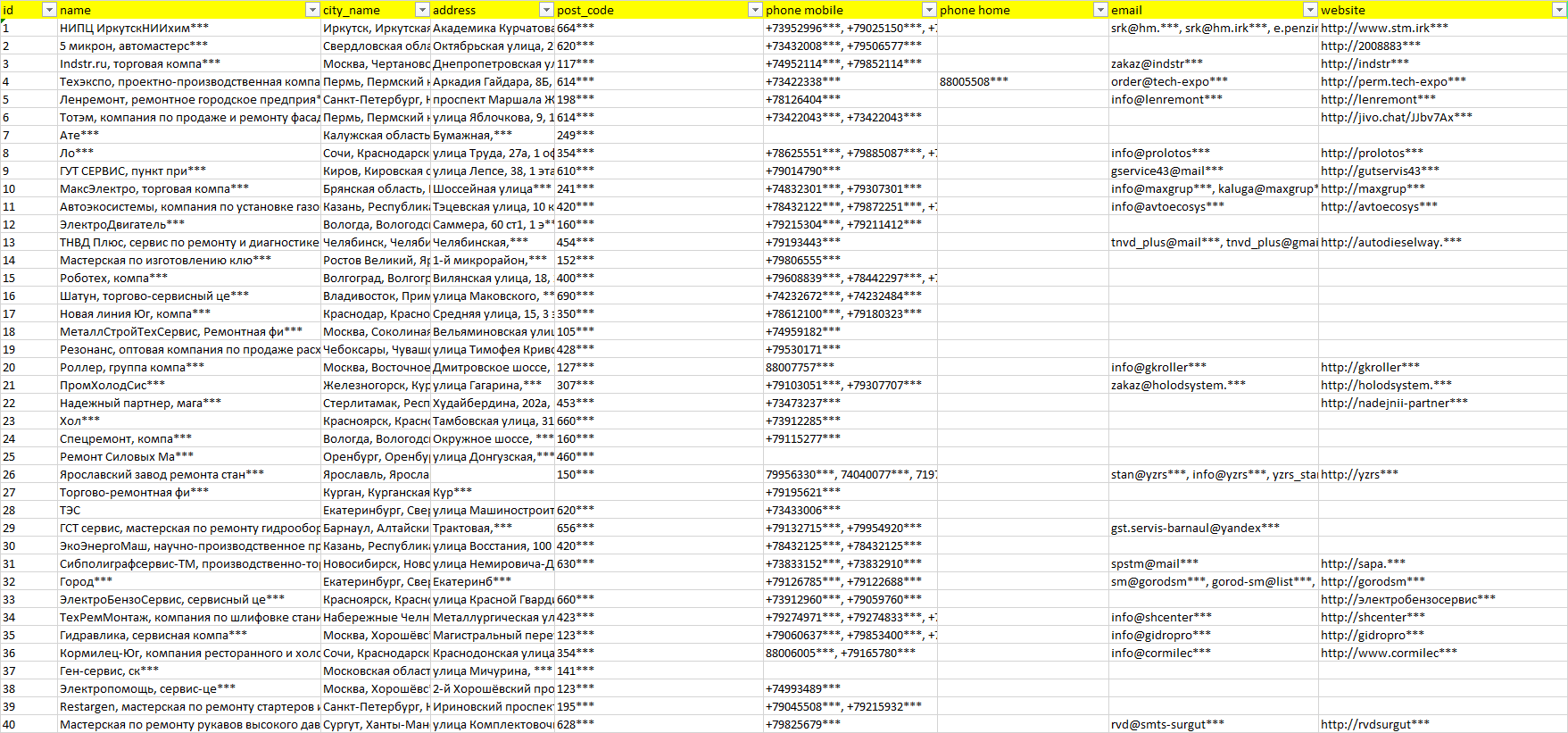 Мы автоматически собираем такие данные с различных открытых источников, обрабатываем, структурирует и упорядочиваем их, предоставляя пользователю возможность скачать результат в формате Excel. По принципу работы наш сервис аналогичен поисковым системам, таким как Google или Яндекс, но с возможностью экспорта найденной информации в удобном табличном виде.