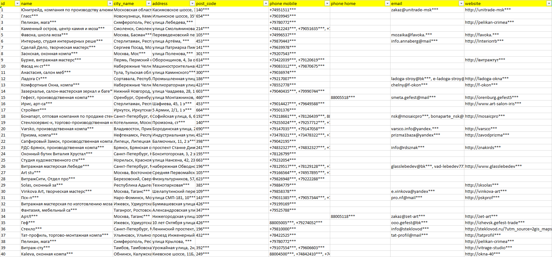 База компаний витражи и мозаика, вся РФ в формате Excel с эл. почтами, телефонами, сайтами, ссылками на соц сети, координатами и другой информацией. Скачайте демо версию, чтобы ознакомиться с данными.