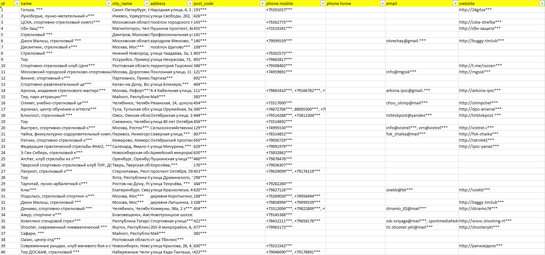 База организаций стрелковые клубы, вся Россия в формате Excel с эл. почтами, телефонами, сайтами, ссылками на соц сети, координатами и другой информацией. Скачайте демо версию, чтобы ознакомиться с данными.
