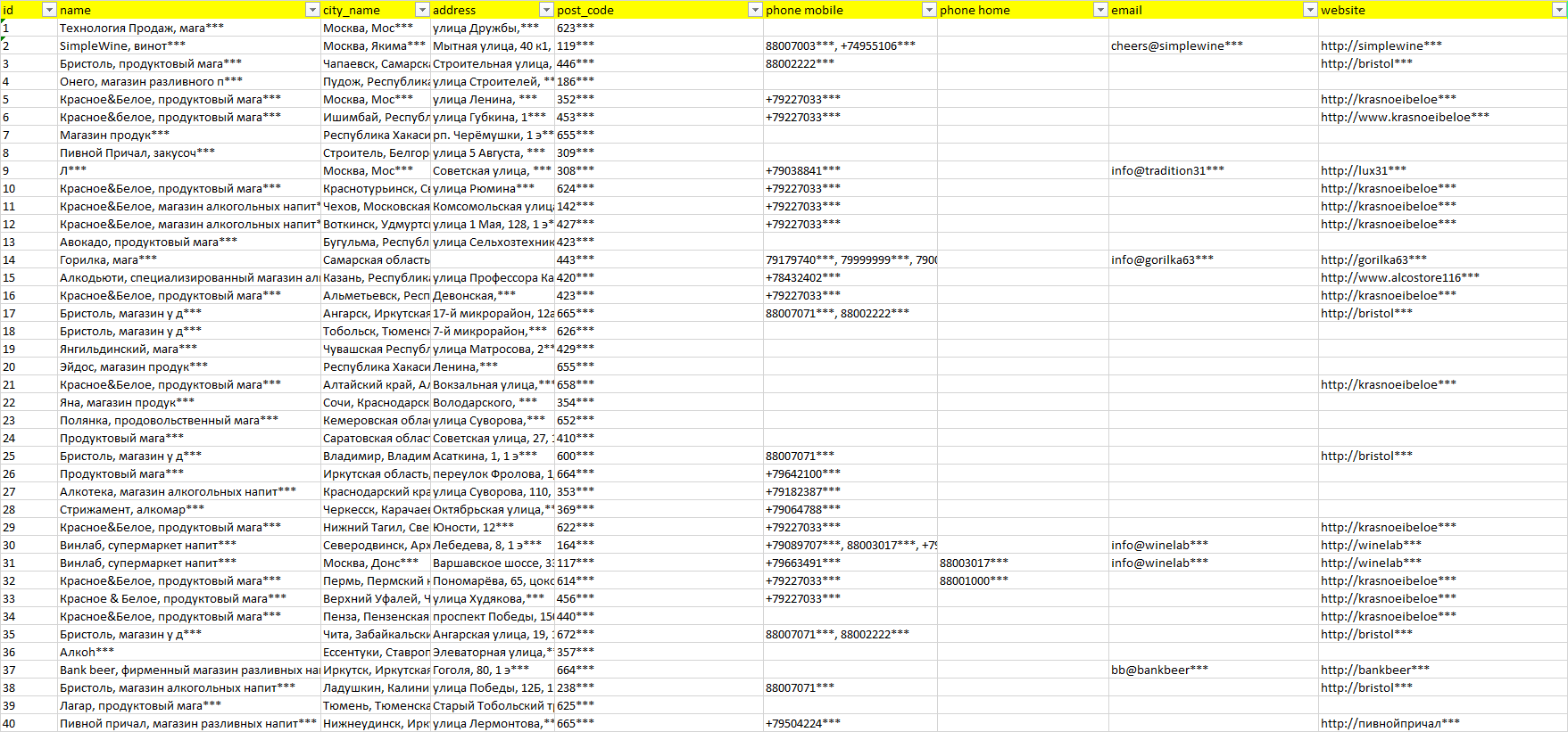База организаций алкогольные напитки, вся Россия в формате Excel с эл. почтами, телефонами, сайтами, ссылками на соц сети, координатами и другой информацией. Скачайте демо версию, чтобы ознакомиться с данными.
