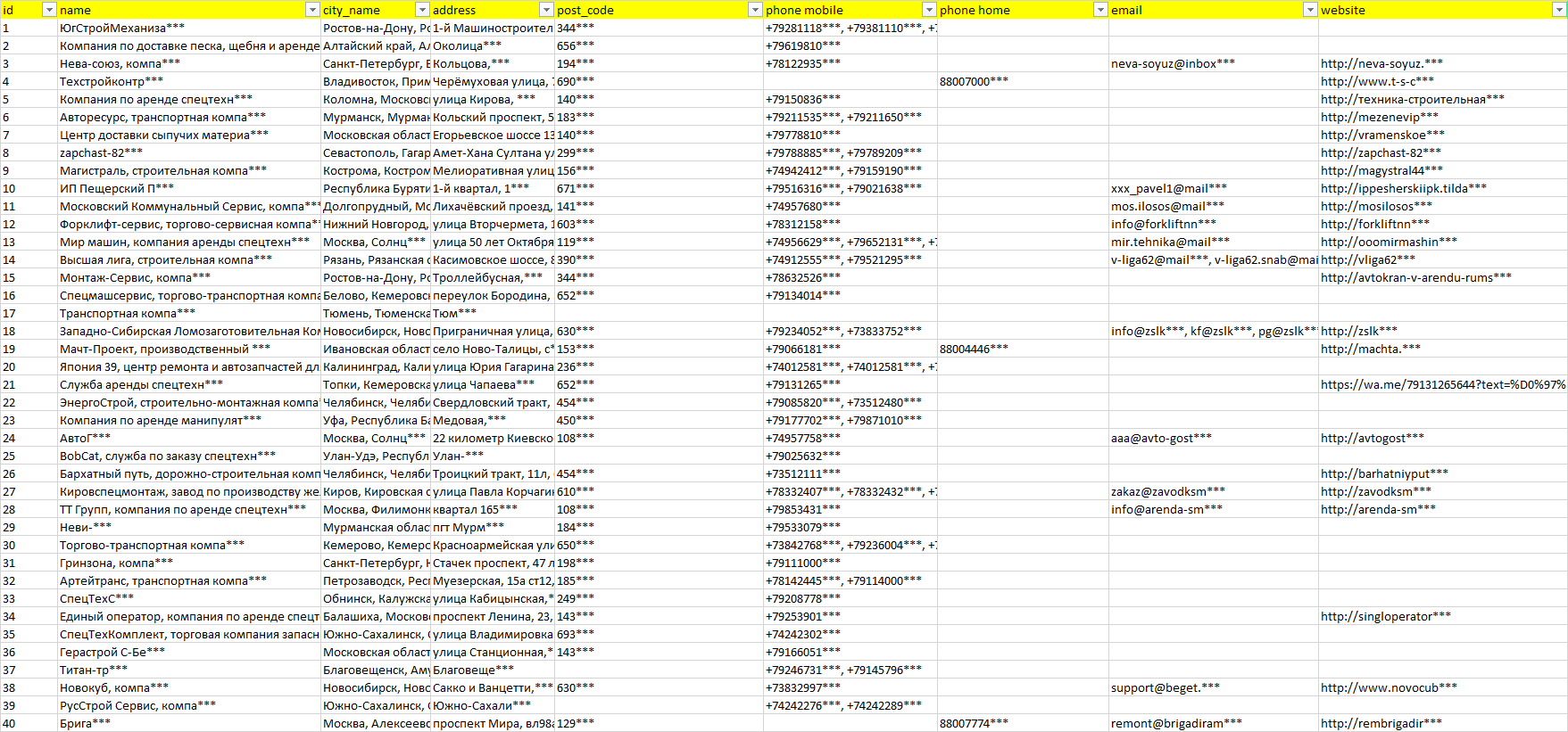 База организаций аренда спецтехники, вся Россия в формате Excel с эл. почтами, телефонами, сайтами, ссылками на соц сети, координатами и другой информацией. Скачайте демо версию, чтобы ознакомиться с данными.