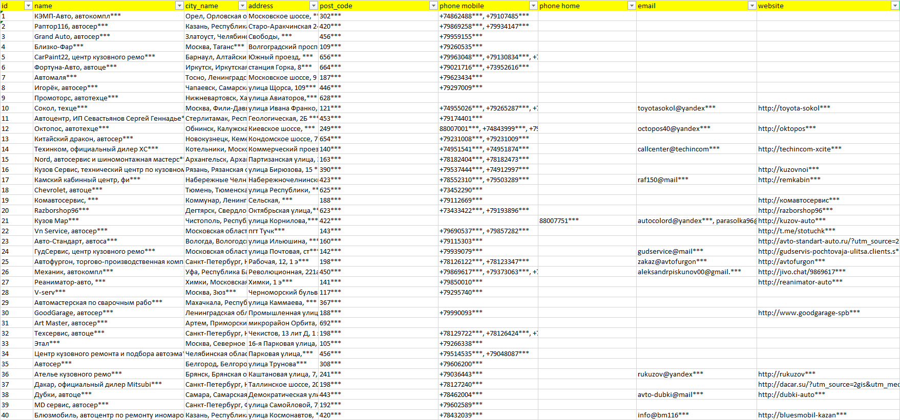 База организаций кузовной ремонт, вся Россия в формате Excel с эл. почтами, телефонами, сайтами, ссылками на соц сети, координатами и другой информацией. Скачайте демо версию, чтобы ознакомиться с данными.