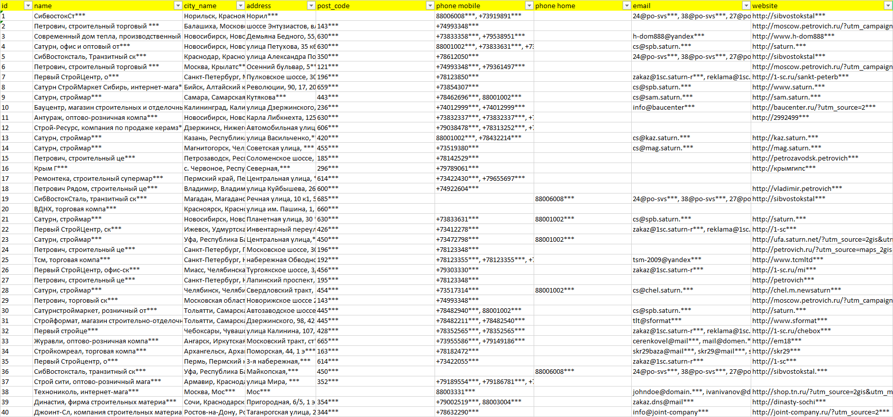 Мы автоматически собираем такие данные с различных открытых источников, обрабатываем, структурирует и упорядочиваем их, предоставляя пользователю возможность скачать результат в формате Excel. По принципу работы наш сервис аналогичен поисковым системам, таким как Google или Яндекс, но с возможностью экспорта найденной информации в удобном табличном виде.
