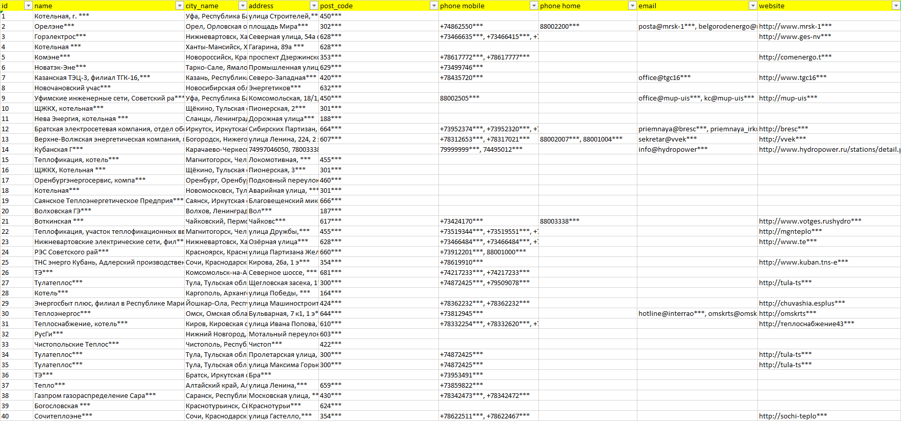 База организаций грэс кэс тэц, вся Россия в формате Excel с эл. почтами, телефонами, сайтами, ссылками на соц сети, координатами и другой информацией. Скачайте демо версию, чтобы ознакомиться с данными.