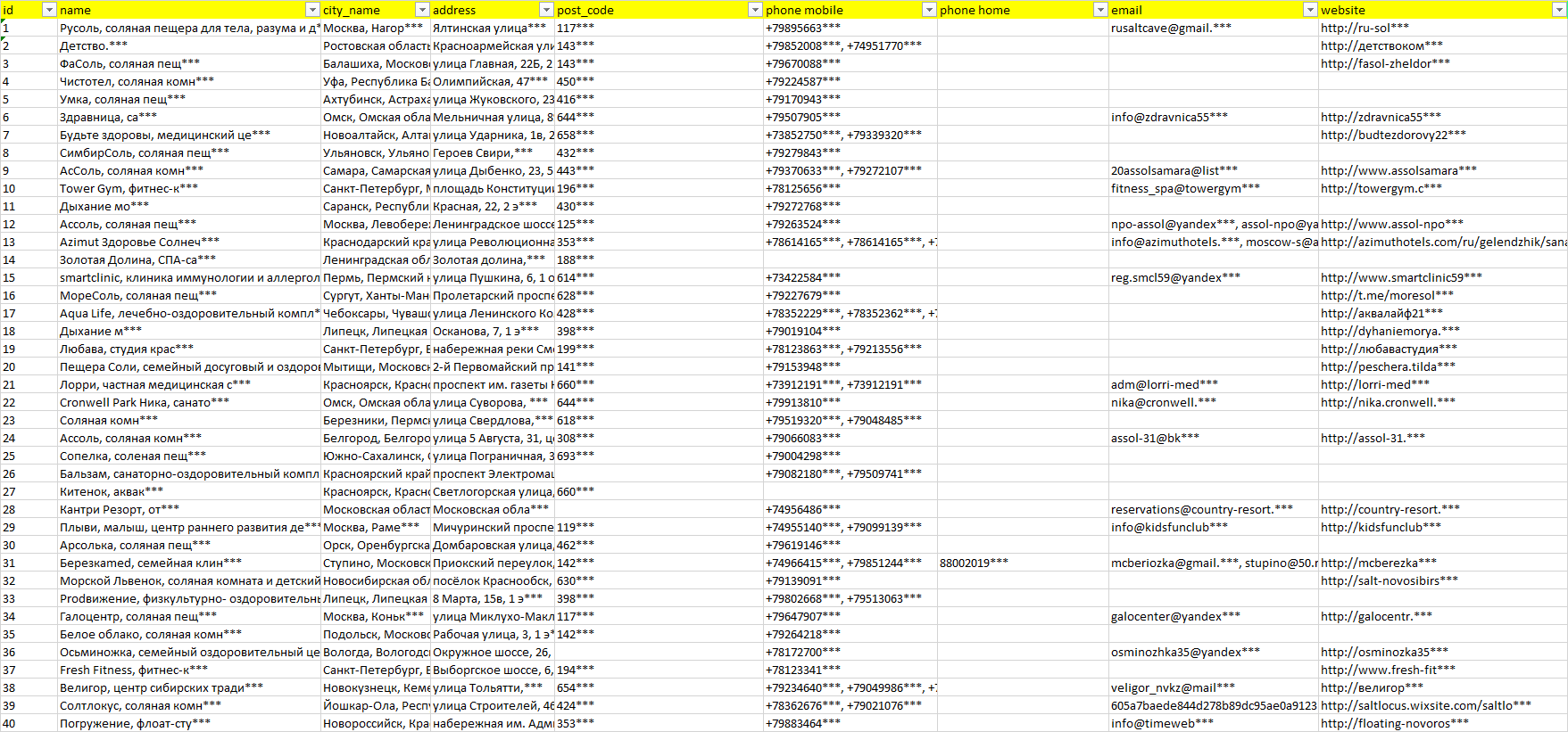 База компаний соляные комнаты, вся РФ в формате Excel с эл. почтами, телефонами, сайтами, ссылками на соц сети, координатами и другой информацией. Скачайте демо версию, чтобы ознакомиться с данными.