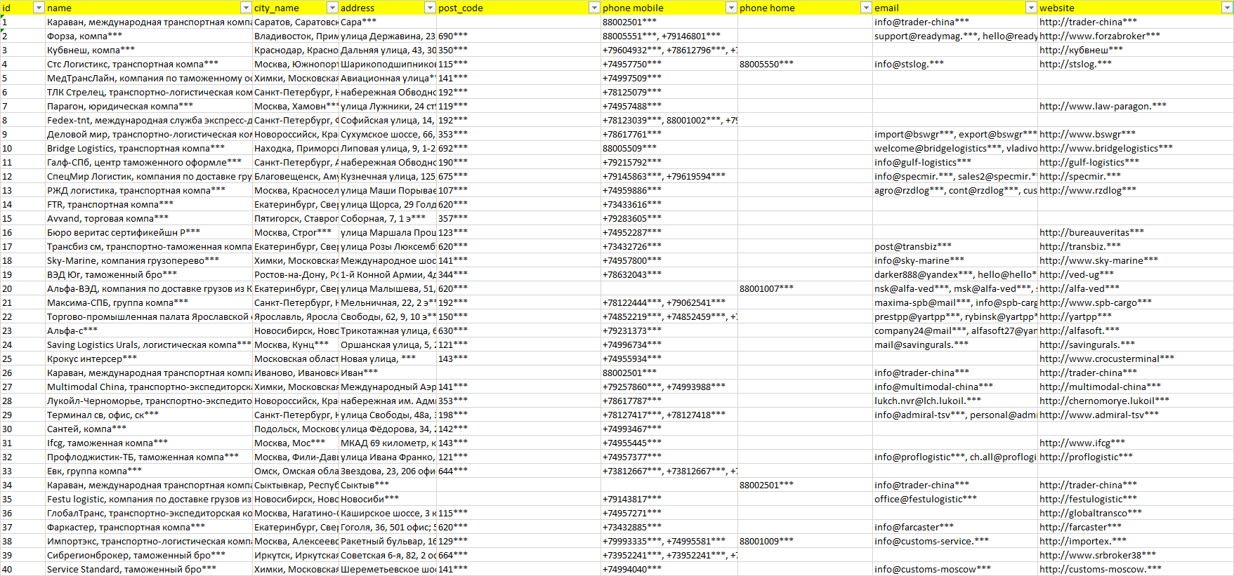 База организаций таможенное оформление, вся Россия в формате Excel с эл. почтами, телефонами, сайтами, ссылками на соц сети, координатами и другой информацией. Скачайте демо версию, чтобы ознакомиться с данными.