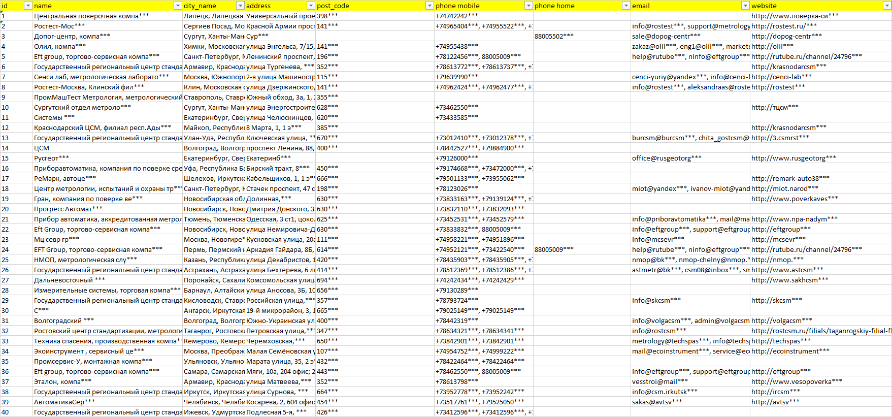 База организаций калибровка измерительных приборов, вся Россия в формате Excel с эл. почтами, телефонами, сайтами, ссылками на соц сети, координатами и другой информацией. Скачайте демо версию, чтобы ознакомиться с данными.