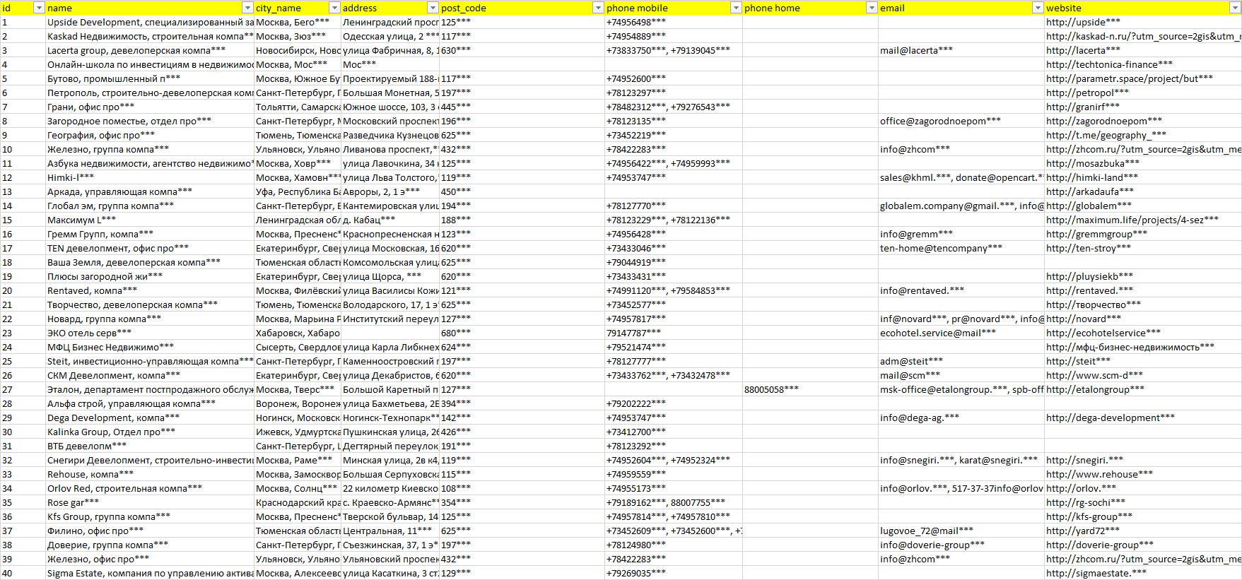База компаний девелопмент, вся РФ в формате Excel с эл. почтами, телефонами, сайтами, ссылками на соц сети, координатами и другой информацией. Скачайте демо версию, чтобы ознакомиться с данными.