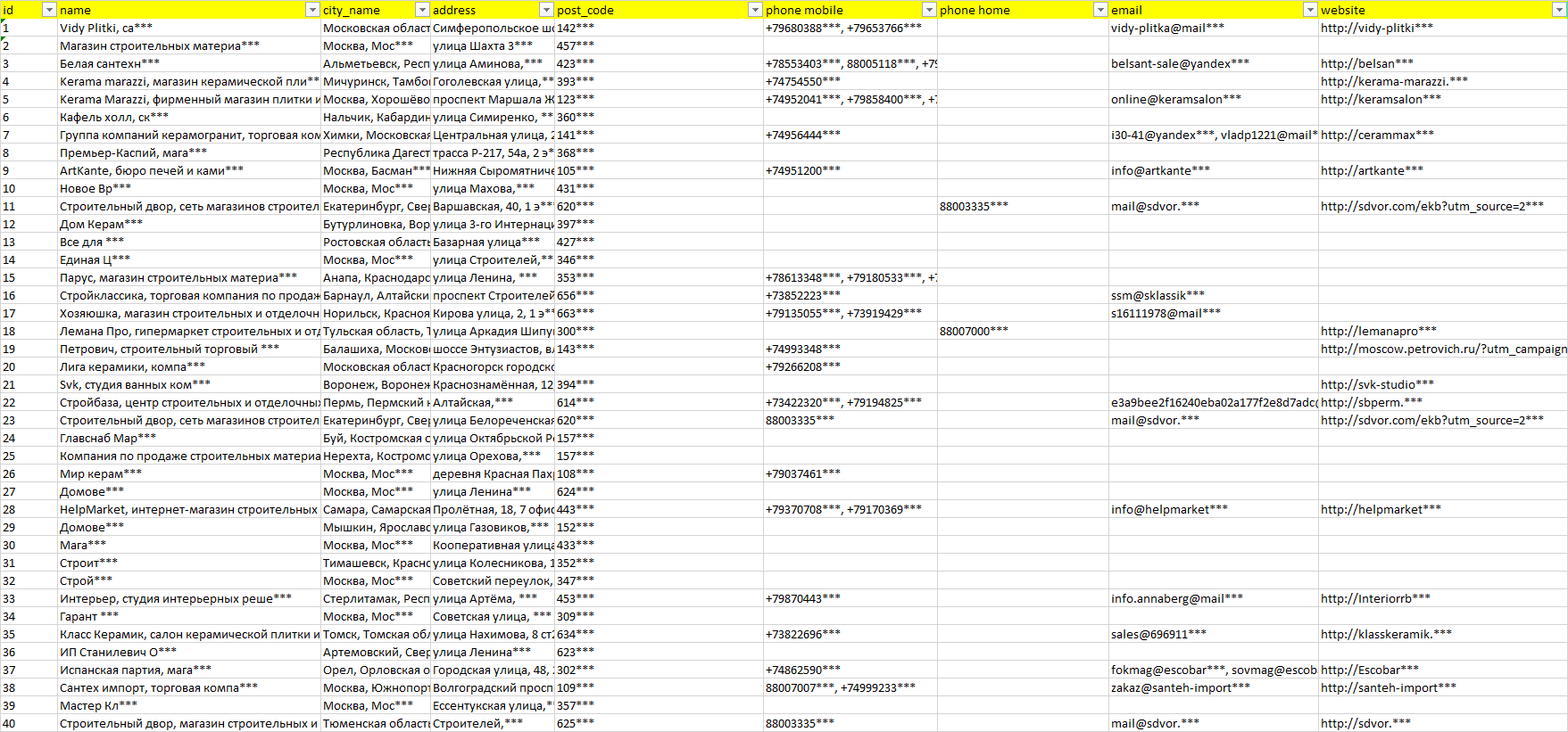 База организаций керамическая плитка, вся Россия в формате Excel с эл. почтами, телефонами, сайтами, ссылками на соц сети, координатами и другой информацией. Скачайте демо версию, чтобы ознакомиться с данными.