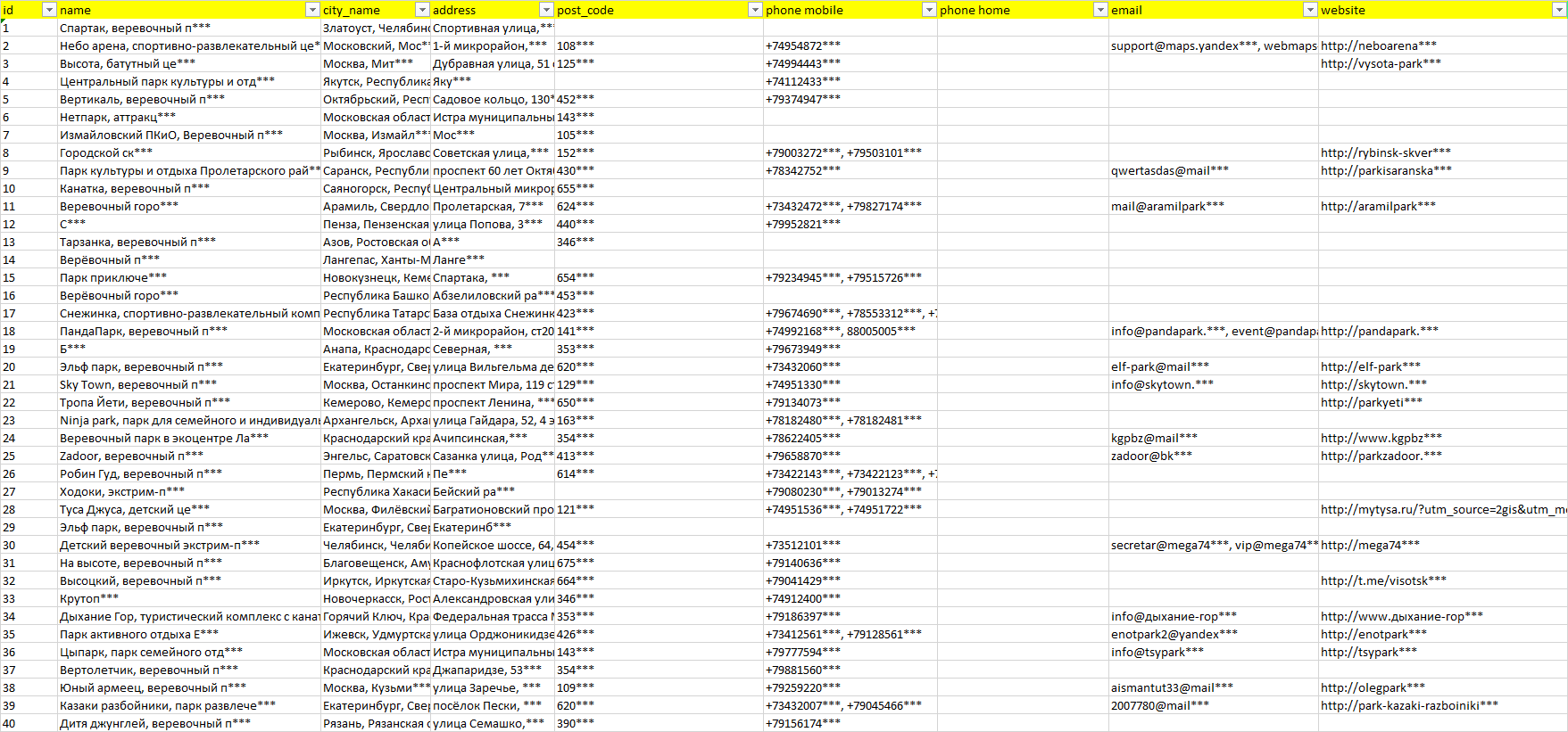 База компаний верёвочные парки, вся РФ в формате Excel с эл. почтами, телефонами, сайтами, ссылками на соц сети, координатами и другой информацией. Скачайте демо версию, чтобы ознакомиться с данными.