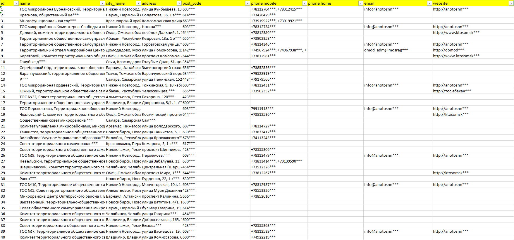 База компаний тосы, вся РФ в формате Excel с эл. почтами, телефонами, сайтами, ссылками на соц сети, координатами и другой информацией. Скачайте демо версию, чтобы ознакомиться с данными.