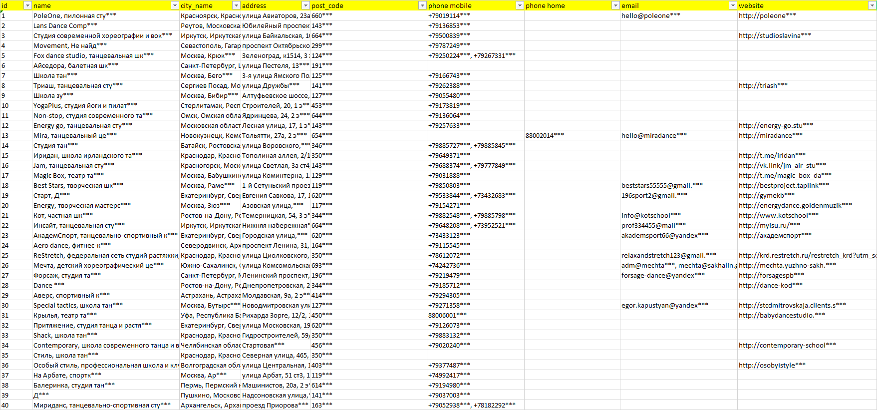 База компаний обучение танцам, вся РФ в формате Excel с эл. почтами, телефонами, сайтами, ссылками на соц сети, координатами и другой информацией. Скачайте демо версию, чтобы ознакомиться с данными.
