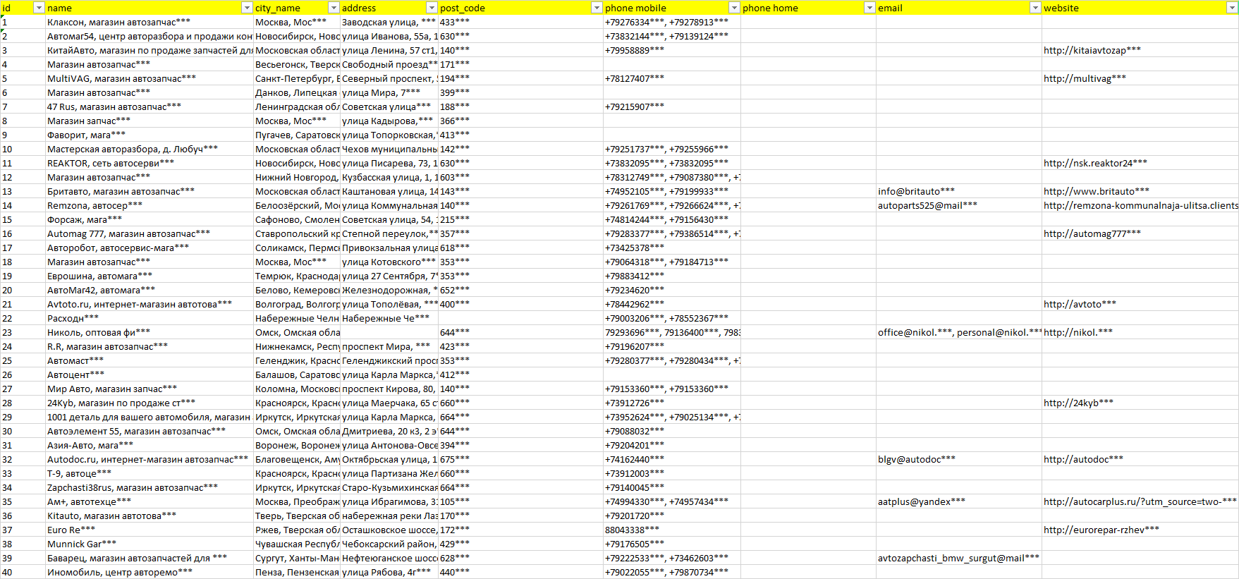 База организаций запчасти для иномарок, вся Россия в формате Excel с эл. почтами, телефонами, сайтами, ссылками на соц сети, координатами и другой информацией. Скачайте демо версию, чтобы ознакомиться с данными.
