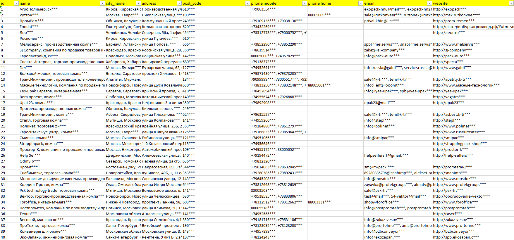 База организаций фасовочно-упаковочное оборудование, вся Россия в формате Excel с эл. почтами, телефонами, сайтами, ссылками на соц сети, координатами и другой информацией. Скачайте демо версию, чтобы ознакомиться с данными.