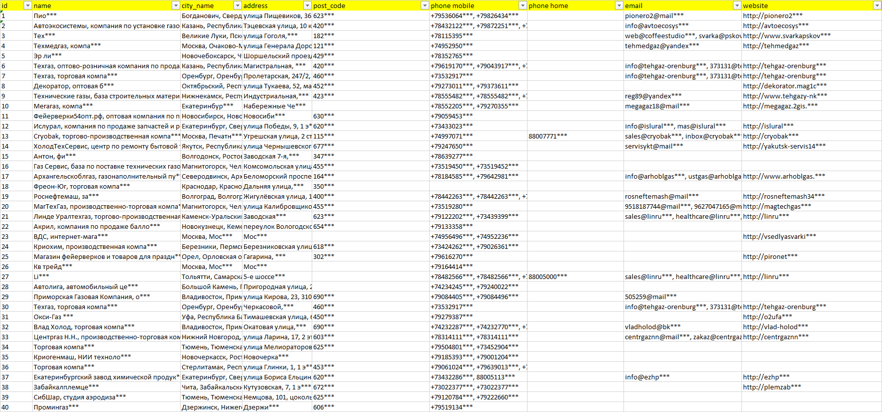 База компаний криогенные жидкости, вся РФ в формате Excel с эл. почтами, телефонами, сайтами, ссылками на соц сети, координатами и другой информацией. Скачайте демо версию, чтобы ознакомиться с данными.