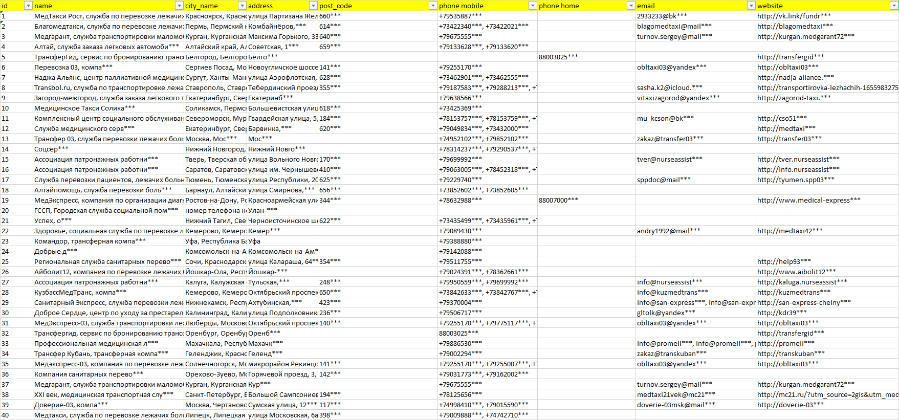 База организаций перевозка людей с ограниченными возможностями, вся Россия в формате Excel с эл. почтами, телефонами, сайтами, ссылками на соц сети, координатами и другой информацией. Скачайте демо версию, чтобы ознакомиться с данными.