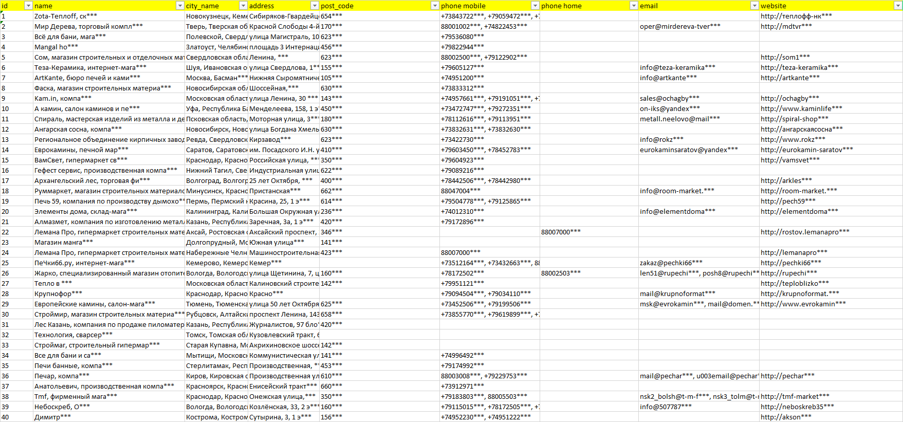 База организаций печи и камины для помещений, вся Россия в формате Excel с эл. почтами, телефонами, сайтами, ссылками на соц сети, координатами и другой информацией. Скачайте демо версию, чтобы ознакомиться с данными.
