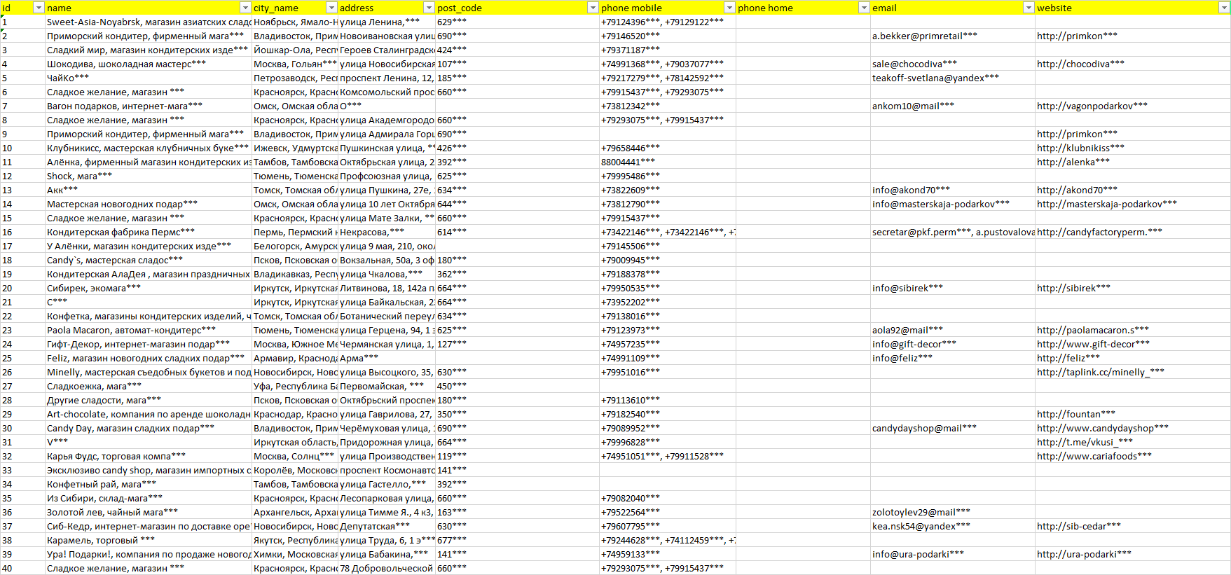 База компаний новогодние сладкие подарки, вся РФ в формате Excel с эл. почтами, телефонами, сайтами, ссылками на соц сети, координатами и другой информацией. Скачайте демо версию, чтобы ознакомиться с данными.