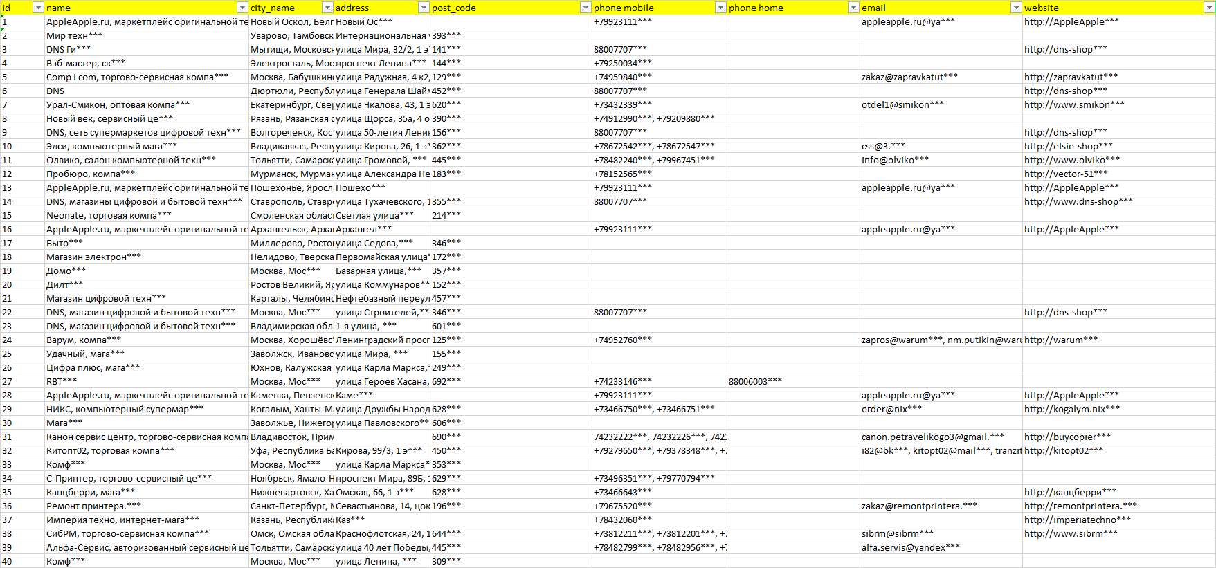 База организаций оргтехника, вся Россия в формате Excel с эл. почтами, телефонами, сайтами, ссылками на соц сети, координатами и другой информацией. Скачайте демо версию, чтобы ознакомиться с данными.