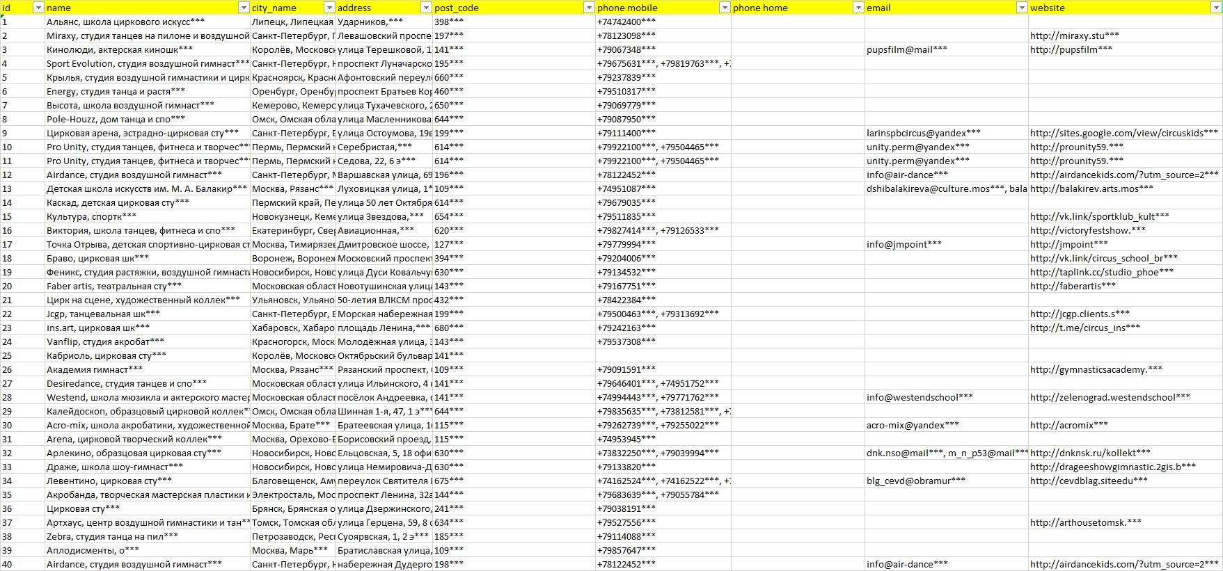 База компаний цирковые школы, вся РФ в формате Excel с эл. почтами, телефонами, сайтами, ссылками на соц сети, координатами и другой информацией. Скачайте демо версию, чтобы ознакомиться с данными.