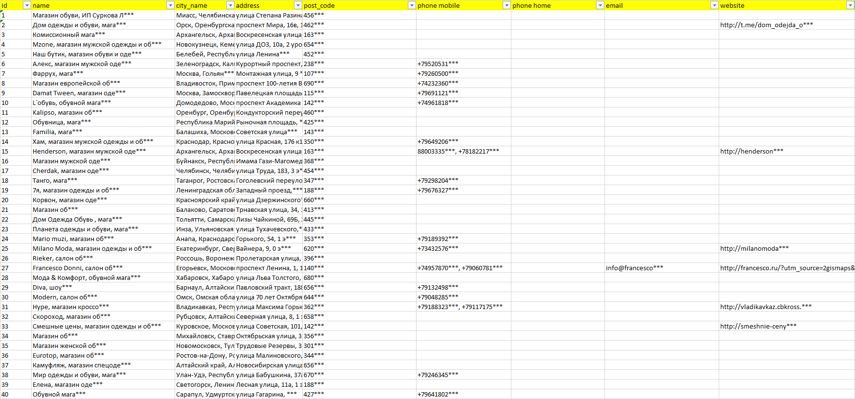 База организаций обувные магазины, вся Россия в формате Excel с эл. почтами, телефонами, сайтами, ссылками на соц сети, координатами и другой информацией. Скачайте демо версию, чтобы ознакомиться с данными.