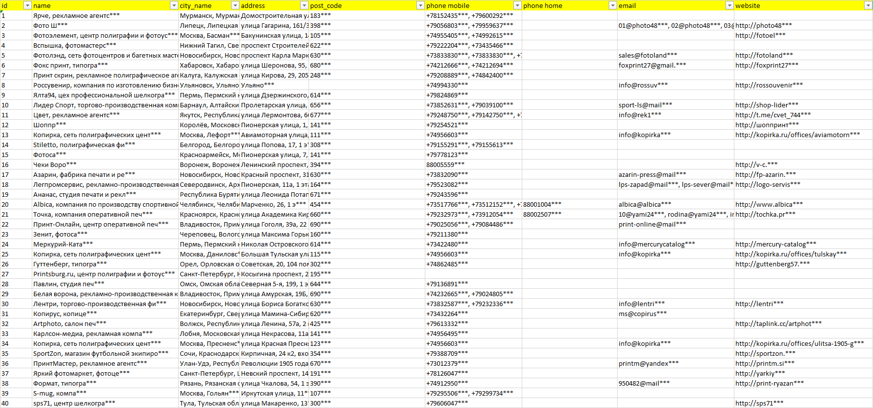Мы автоматически собираем такие данные с различных открытых источников, обрабатываем, структурирует и упорядочиваем их, предоставляя пользователю возможность скачать результат в формате Excel. По принципу работы наш сервис аналогичен поисковым системам, таким как Google или Яндекс, но с возможностью экспорта найденной информации в удобном табличном виде.