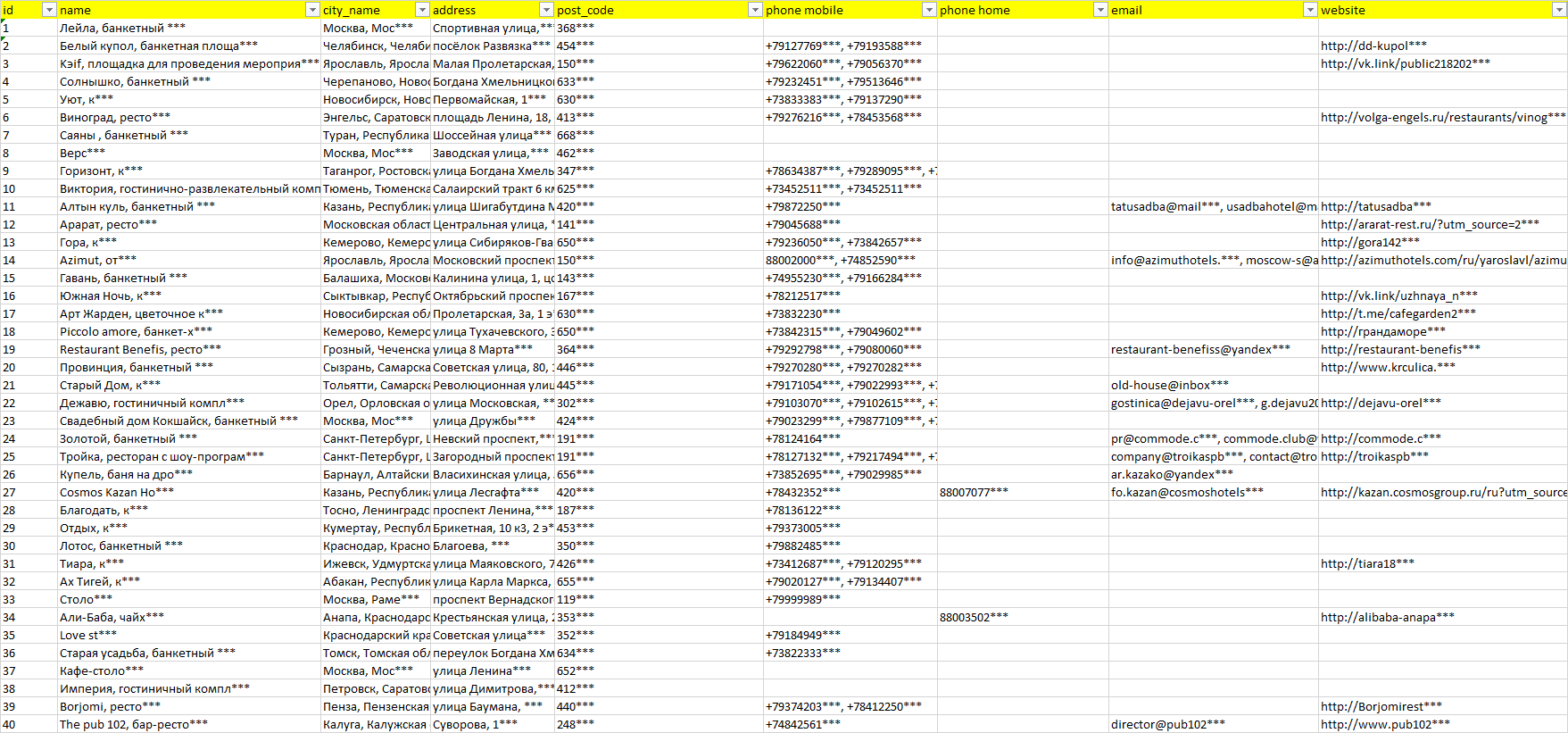 База компаний банкетные залы, вся РФ в формате Excel с эл. почтами, телефонами, сайтами, ссылками на соц сети, координатами и другой информацией. Скачайте демо версию, чтобы ознакомиться с данными.