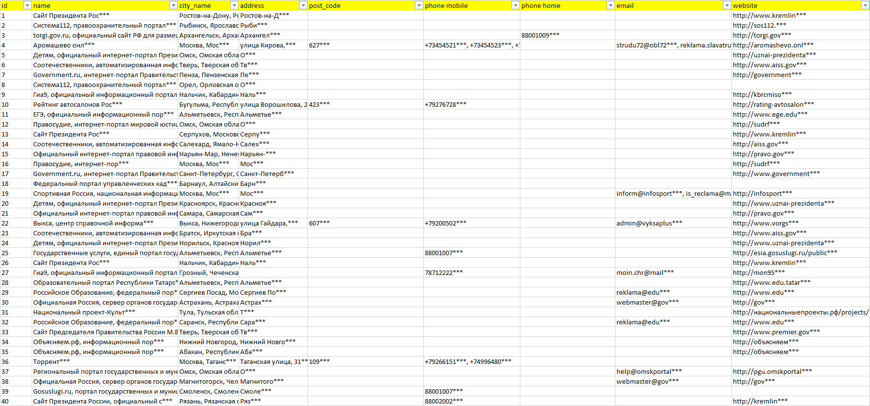 База компаний государственные сайты, вся РФ в формате Excel с эл. почтами, телефонами, сайтами, ссылками на соц сети, координатами и другой информацией. Скачайте демо версию, чтобы ознакомиться с данными.