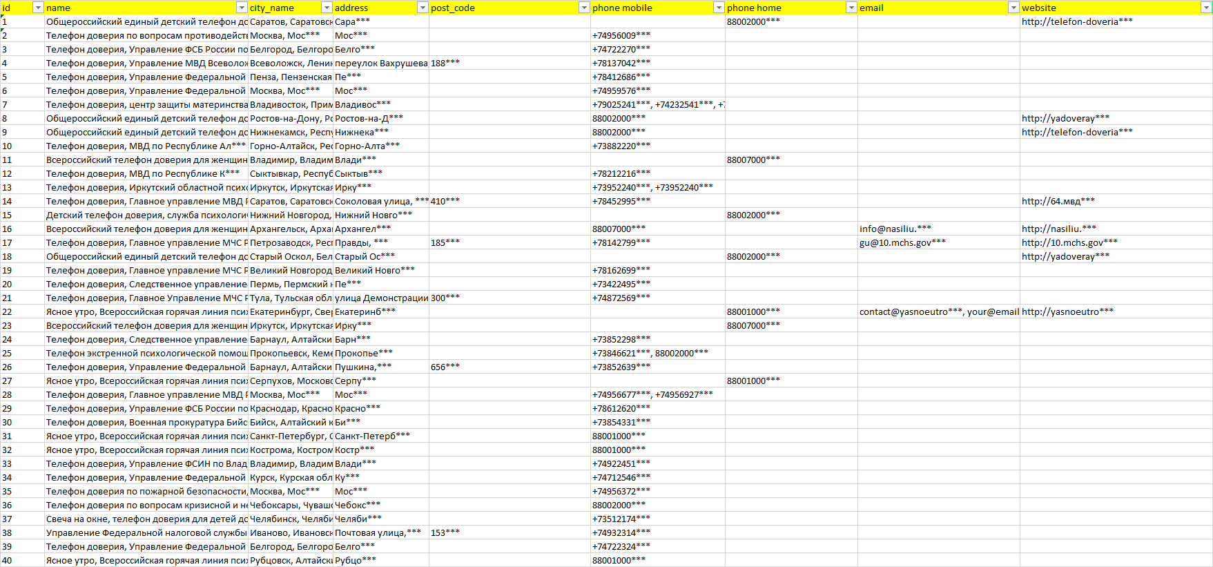 База организаций телефоны доверия, вся Россия в формате Excel с эл. почтами, телефонами, сайтами, ссылками на соц сети, координатами и другой информацией. Скачайте демо версию, чтобы ознакомиться с данными.